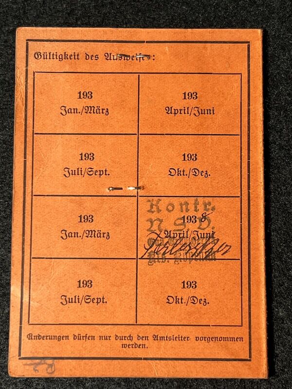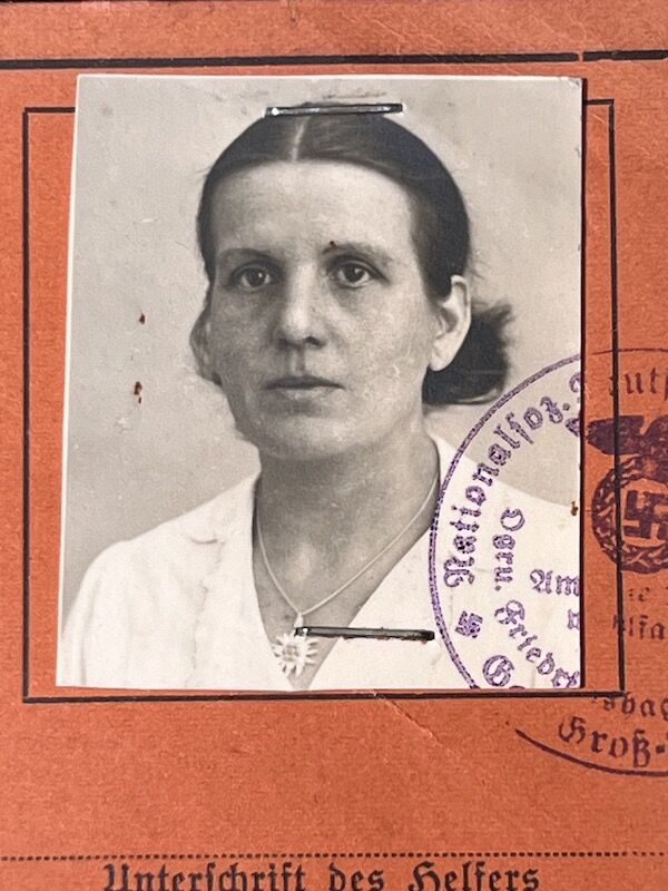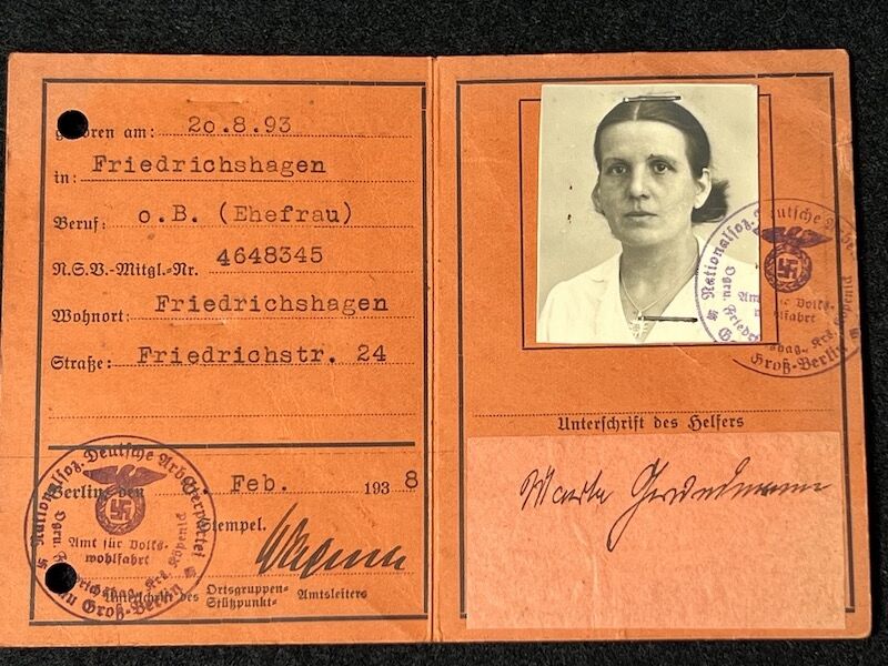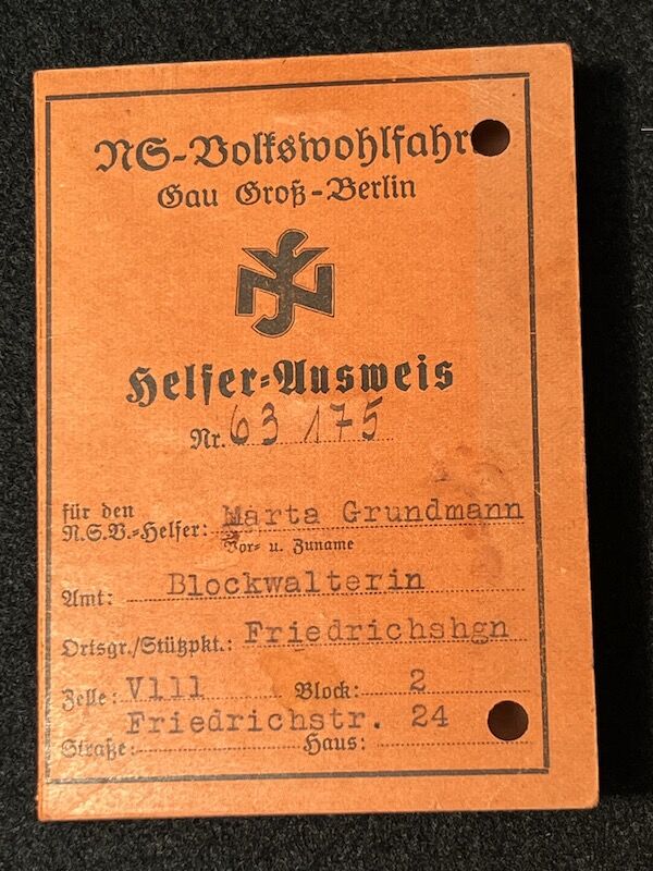 WWII German National Socialist People’s Welfare NSV Identity Card – Blockwalterin Marta Grundmann – Berlin Friedrichsagen – Rare