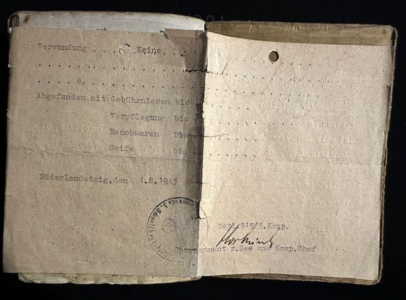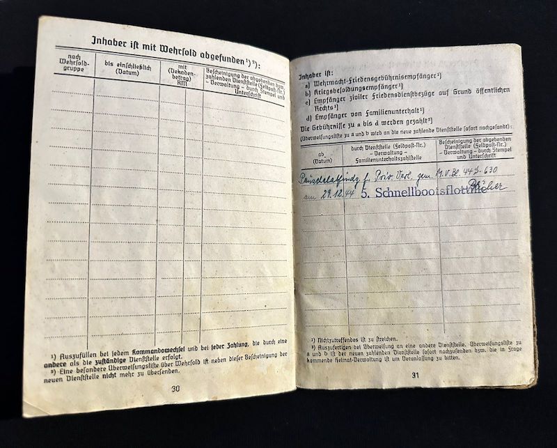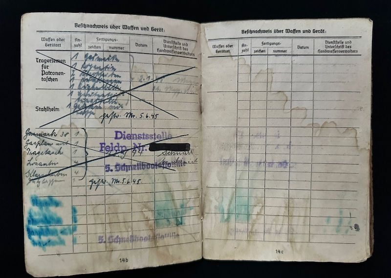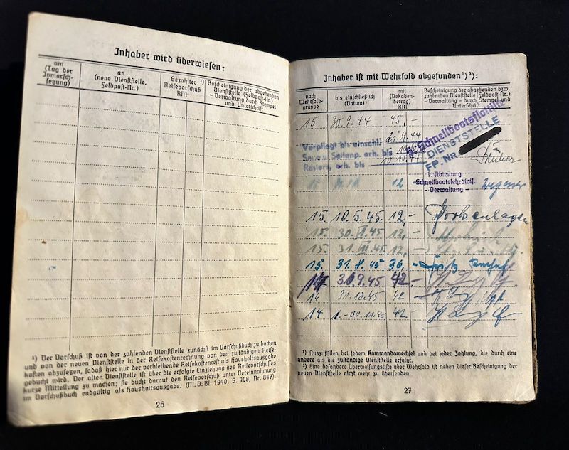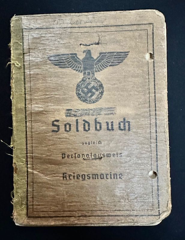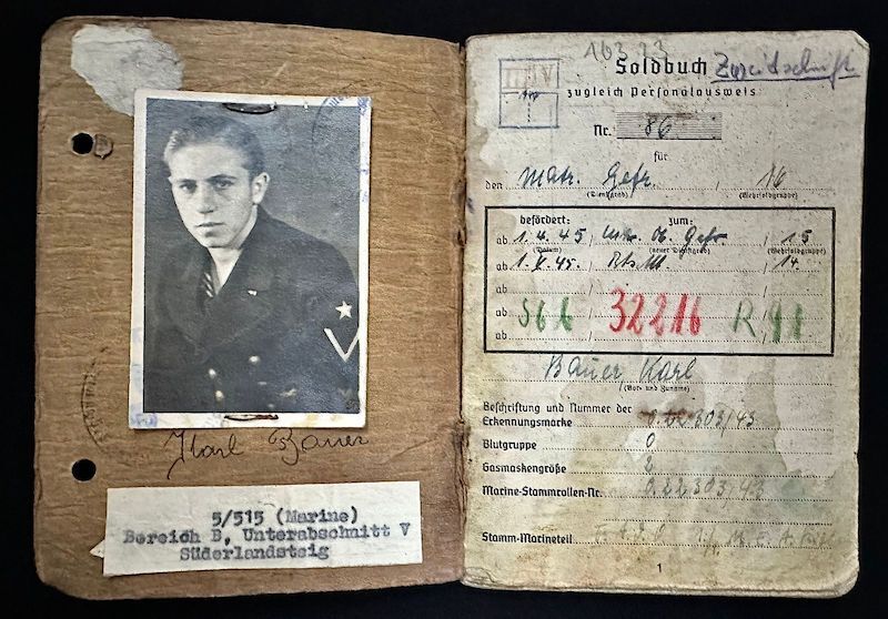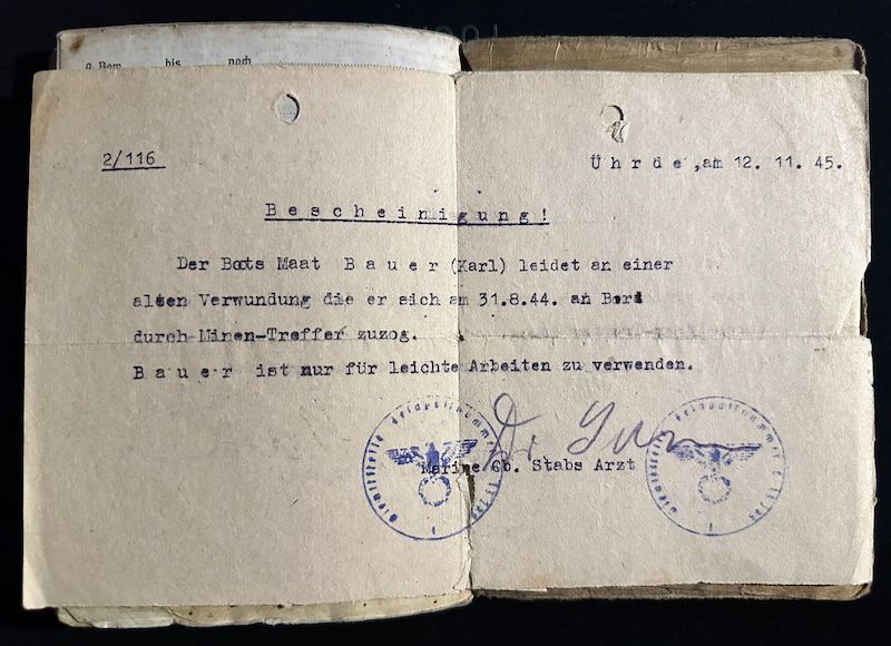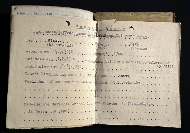 WWII German Navy Soldbuch – Kriegsmarine – S Boot – Btsmt Bauer – 5 Schnellbootsflottille – Fast Attack Craft War Badge – 12 Days Combat Entered – Badge in Wear on Photo – Wounded by a Mine at Sea – Rare (Offer Accepted