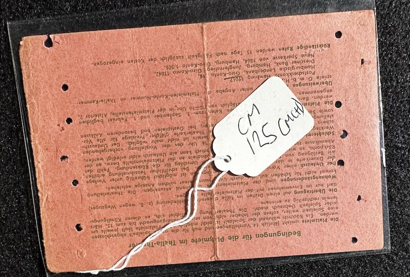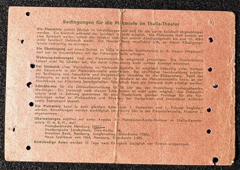 WWII German Original Thalia-Theater Hamburg 1942/43 Ticket – Rare