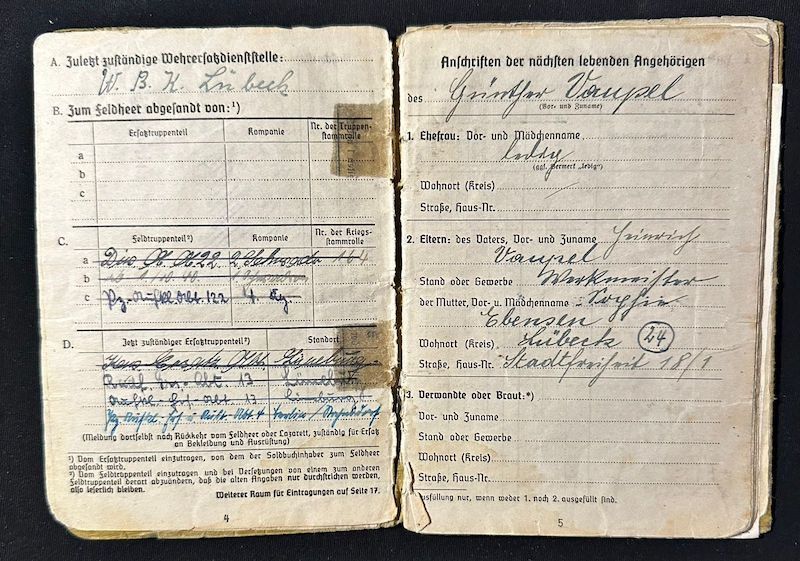 WWII German Soldbuch – Oberfeldwebel Vaupel – Panzer Aufklärungs Abt 122 (Panzerspäh-Kompanie) – 22 Infanterie Division – Holland 1940 – Greece/Kreta 1941 – Kurland 1945 – 6 Medals – Close Combat Days (Lay Away)