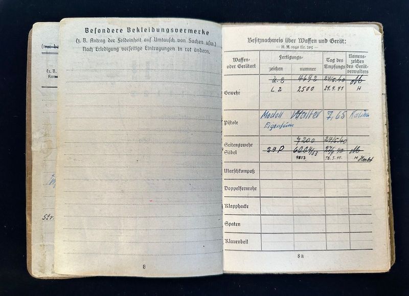 He was issued a Rifle or MG: L2 – I was unable to find out what this designation was. He had his own private pistol a 7.65mm Walther