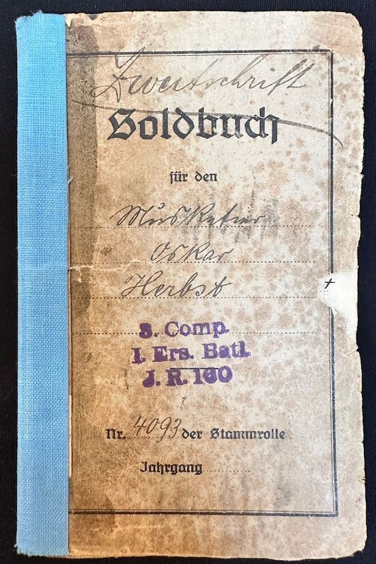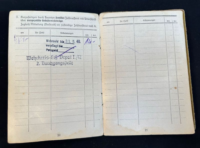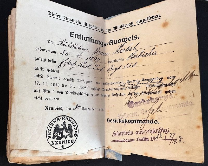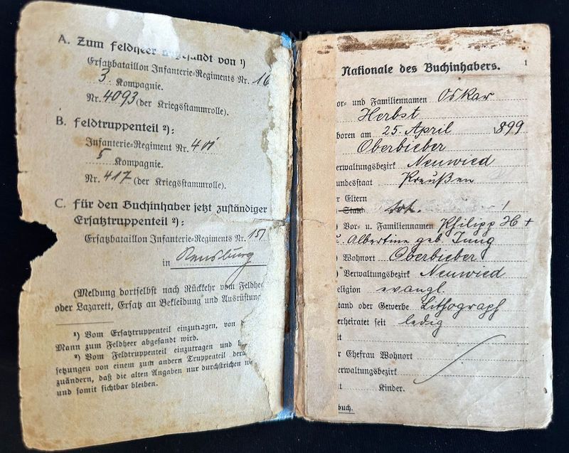WWII German Soldbuch – Schirrmeister Herbst – Landespionier-Regiment 12 – Kommandanten der Rheinübergänge- Bridge Guard Mainz-Kastell – Western Front – WWI Soldbuch – Veteran of Two World Wars