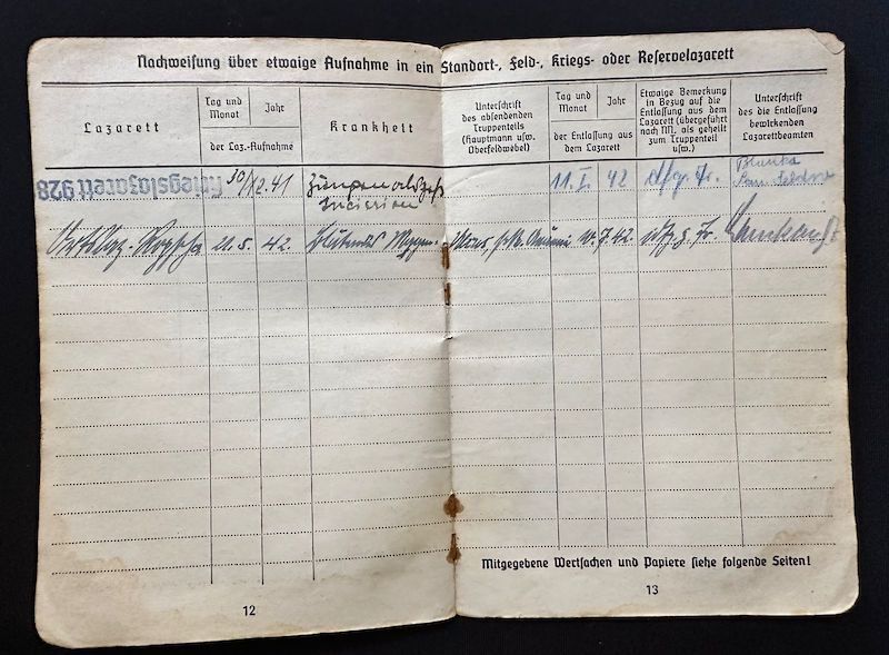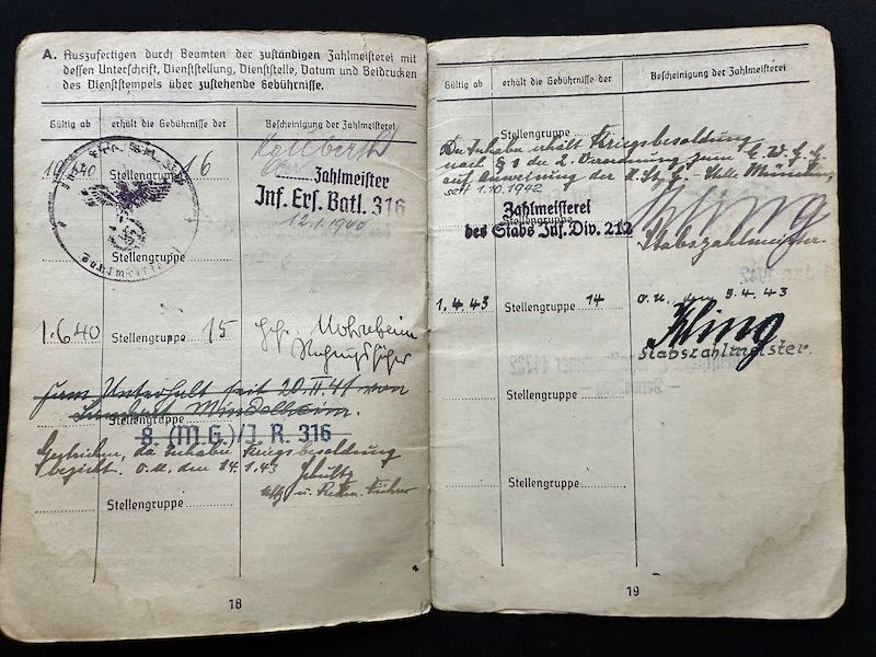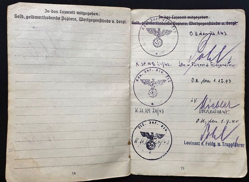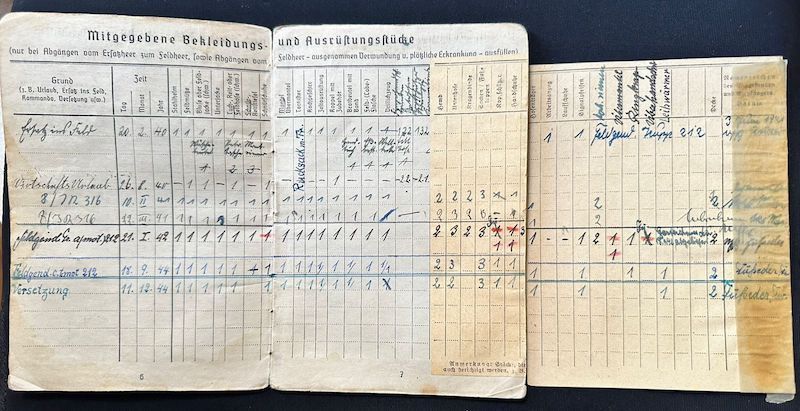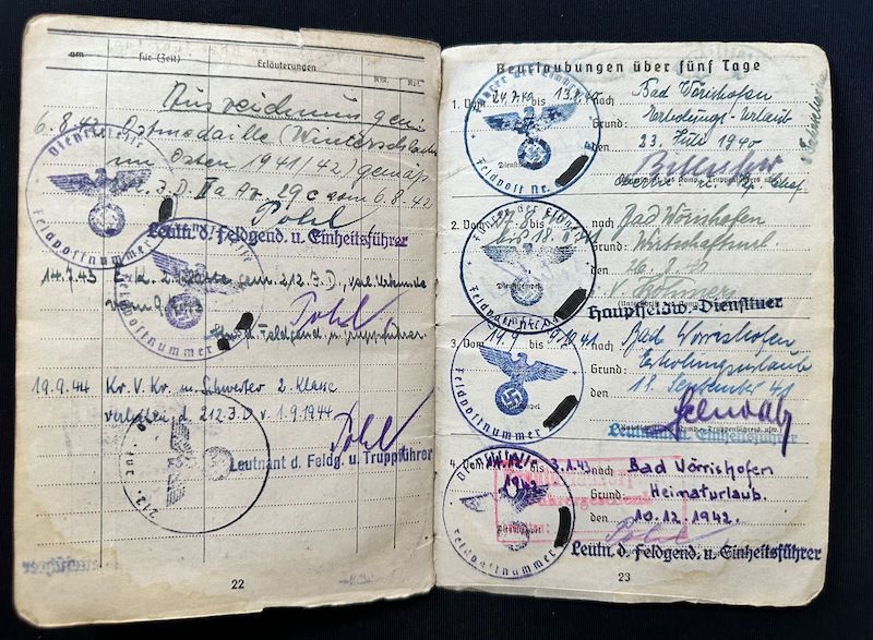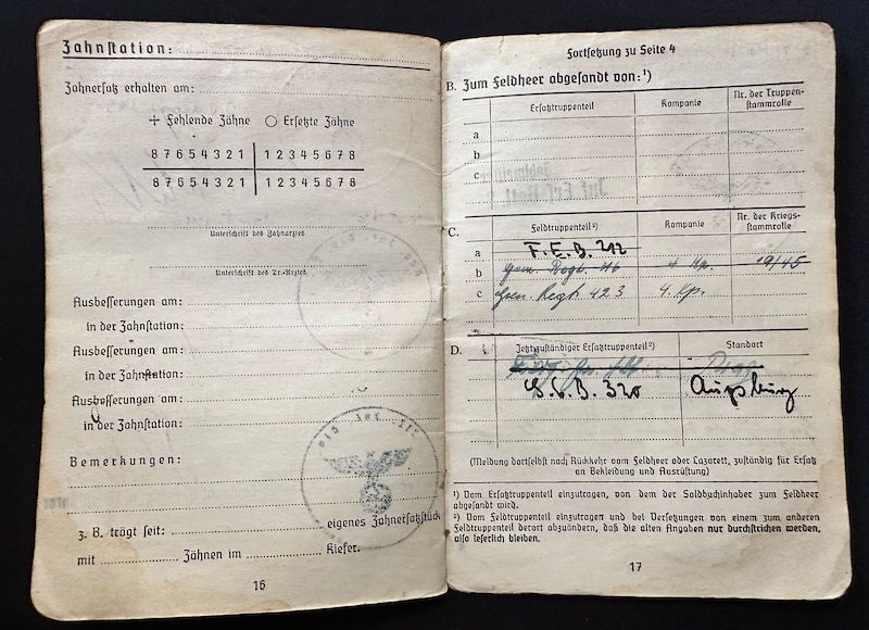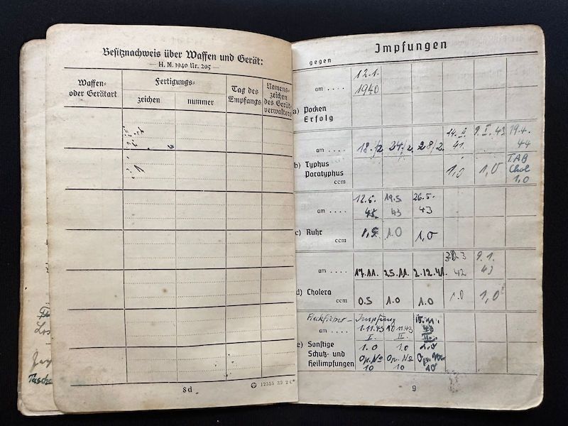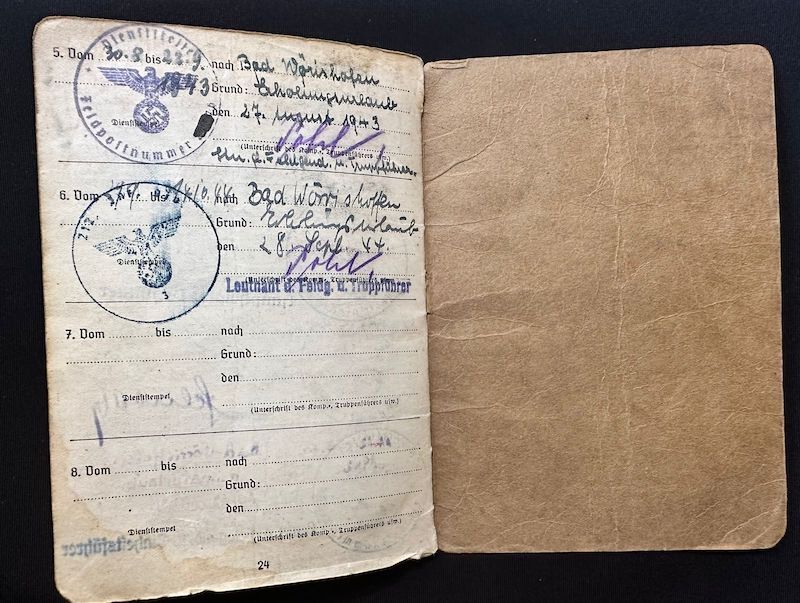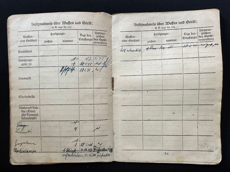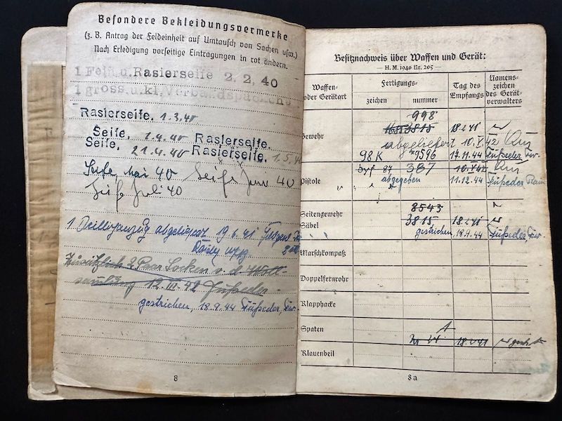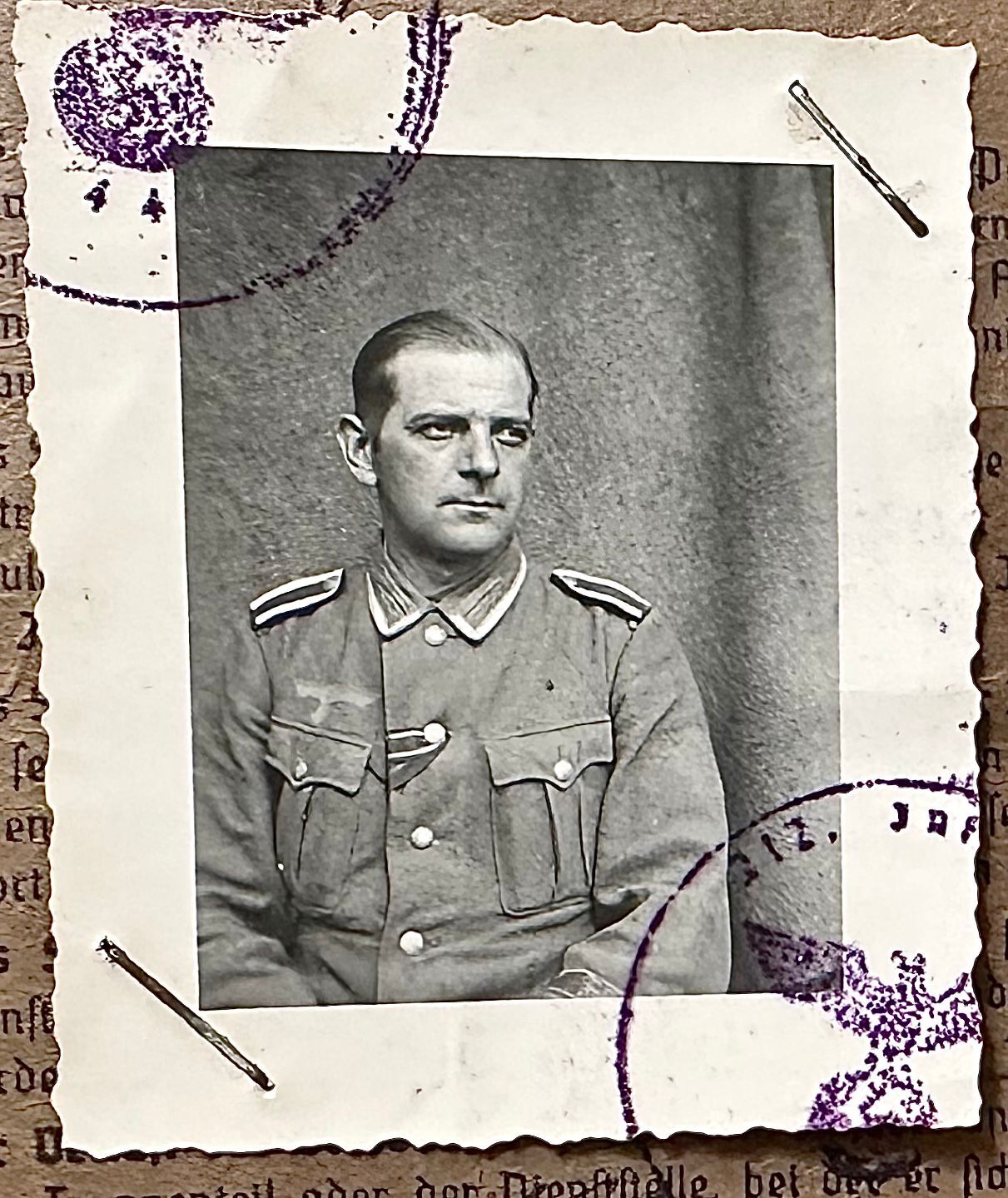 This Soldbuch seen both the Eastern and Western Fronts. Interestingly, the so called Kettenhunde were hated among the German Army. In his Soldbuch photo you can see the edge of the Cuff title for the Feldgendarmerie, which I have never seen before in a Soldbuch photo.