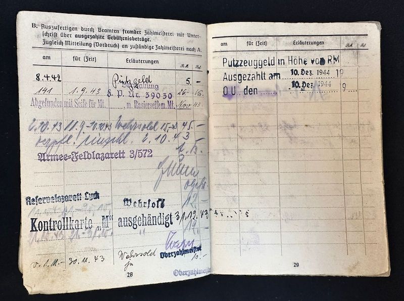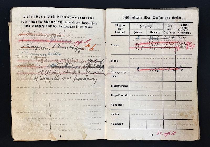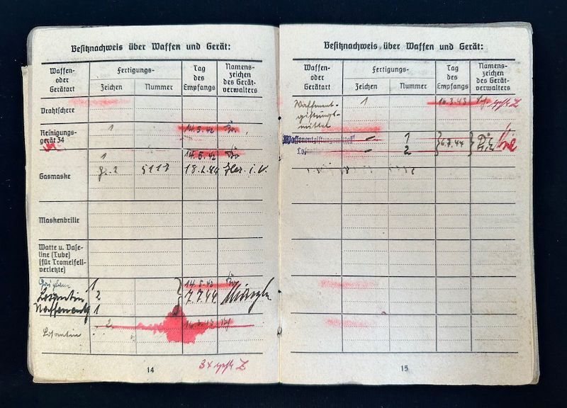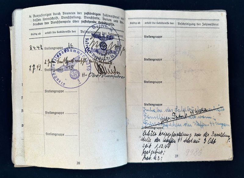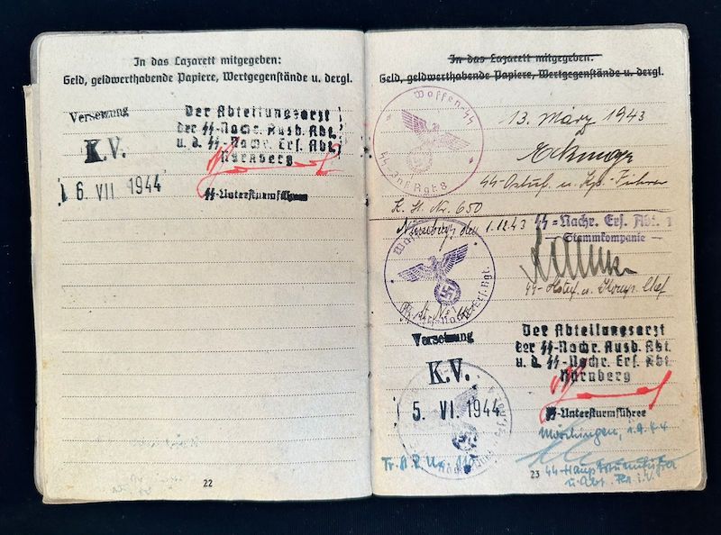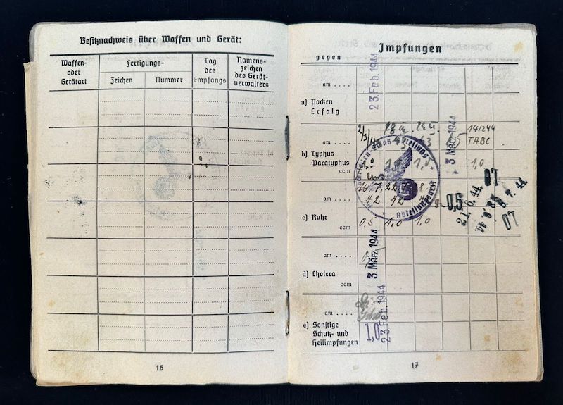 An exceptional Soldbuch to a Hungarian born Volksdeutsche who seen some of the most formidable units fielded during WWII. It seems the photo was replaced during the war with his upgraded rank and awards, which happened quite often. A fully original untouched item.