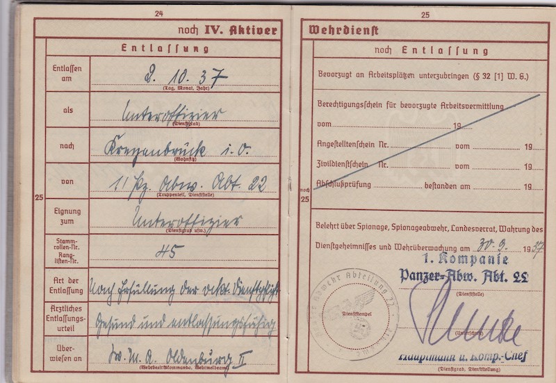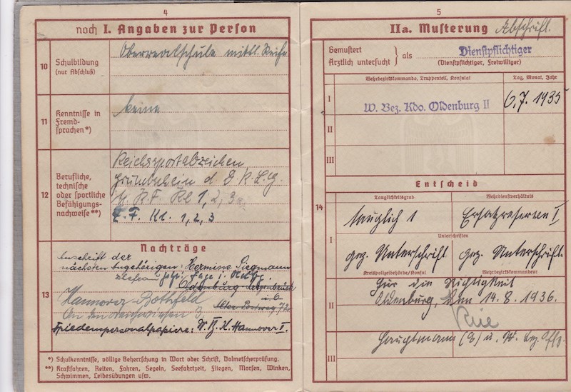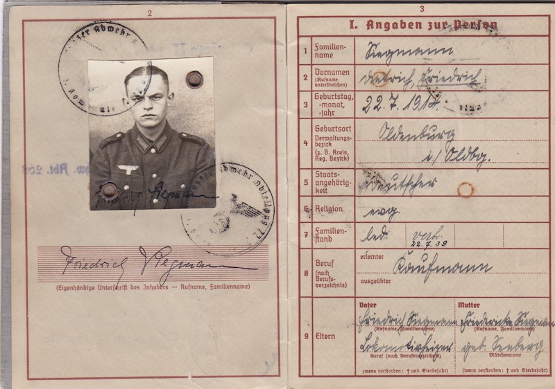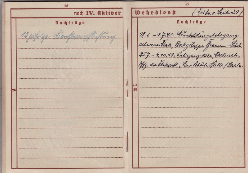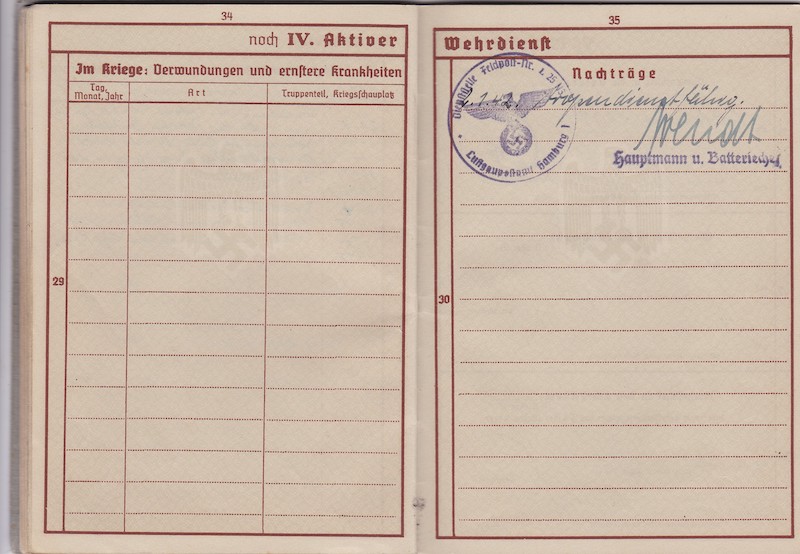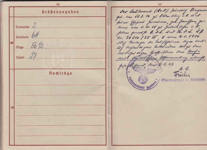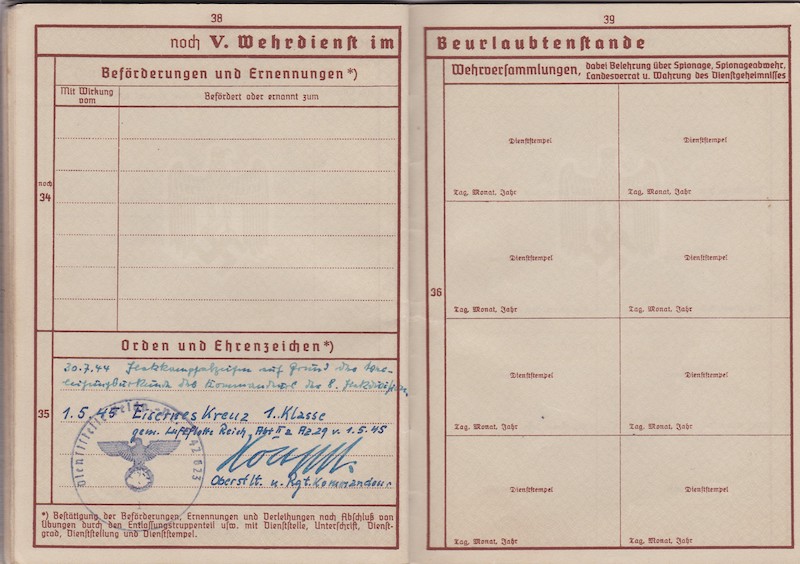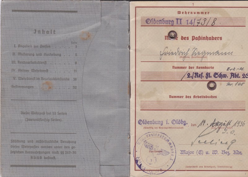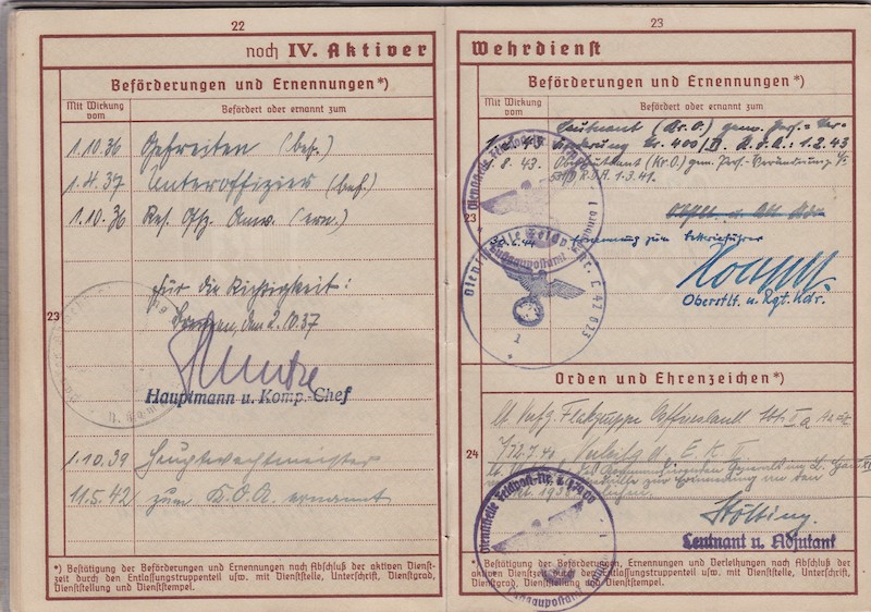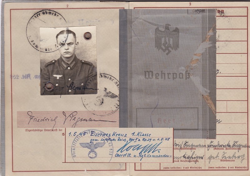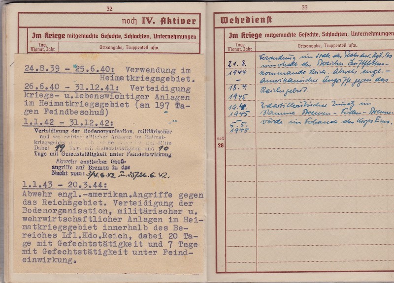 WWII German Wehrmacht/Luftwaffe Wehrpass ID – Oberleutnant Siegmann – Flakscheinwerfer-Abteilung 268 (o) (Flakgruppe Bremen) – Korps Ems – EK1 1st of May 1945!