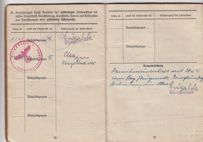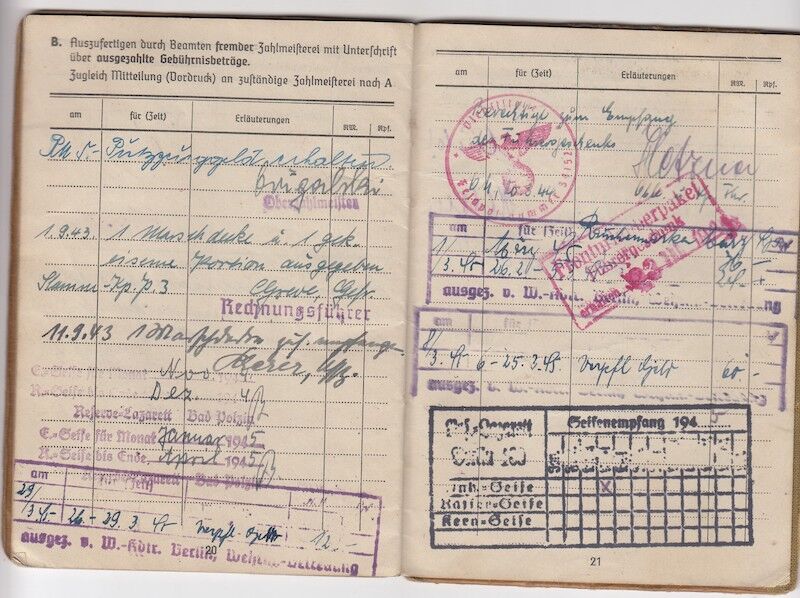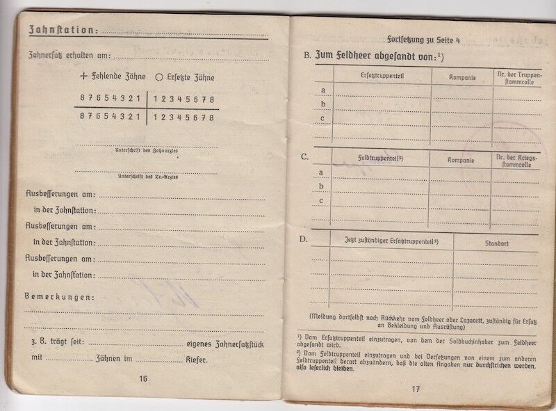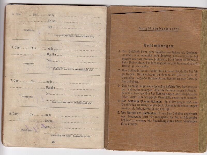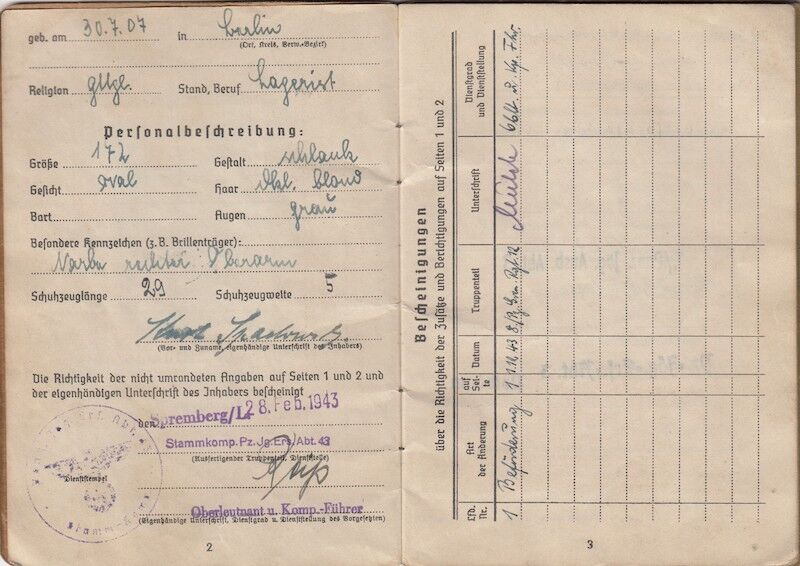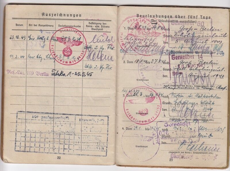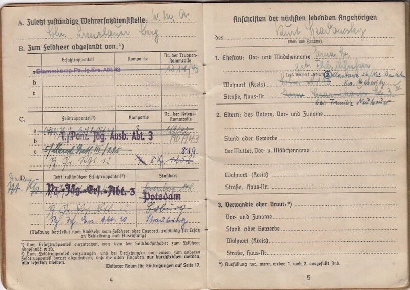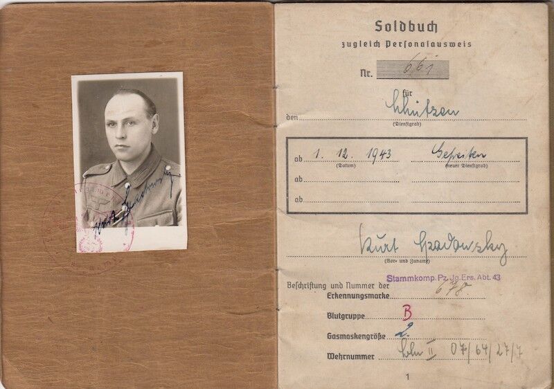 WWII German Wehrmacht Soldbuch ID – Gefreiter Kurt Szadowsky – Panzer Grenadier Regiment 12 – 4 Panzer Division – Reservelazarett 109 Berlin-Charlottenburg 1945