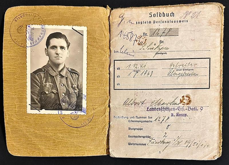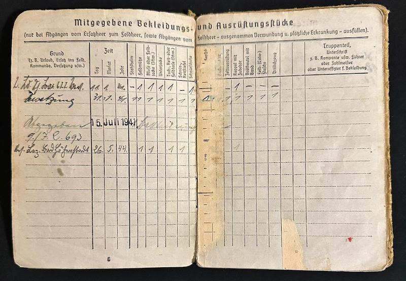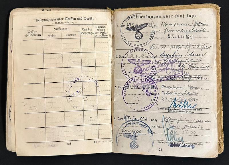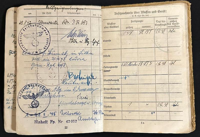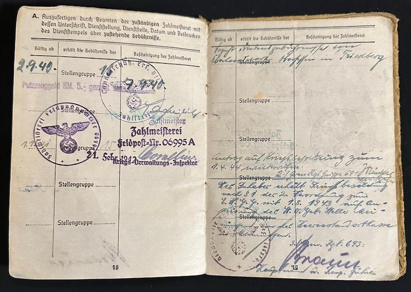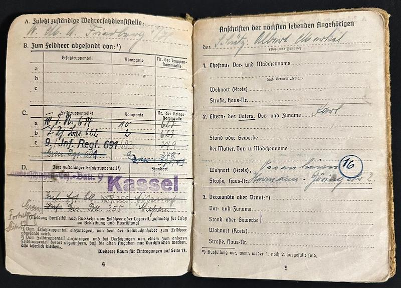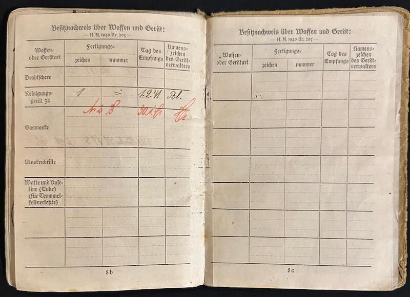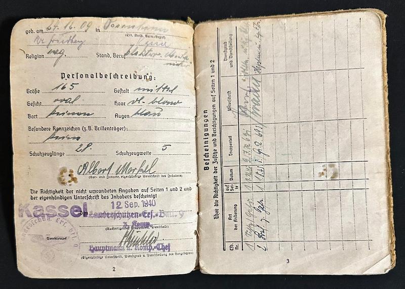 Issued on the the 12th of September 1940 in Kassel with Landesschützen Ersatz Batl 9 to Albert Merkel from the Kassel area. He was born in 1909 into a protestant family. His next of kin was his father living on Hermann-Göring Street.