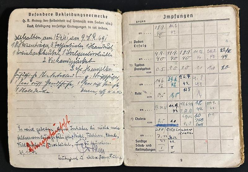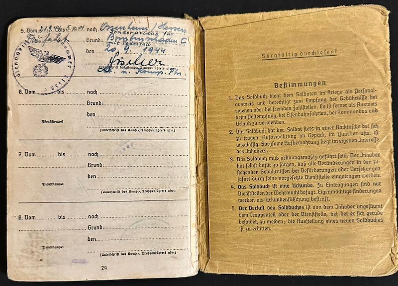 A nice Soldbuch, clean cover and with combat entries. Nice Uniformed picture. Sad strory with his family getting killed so close to the end of the war.