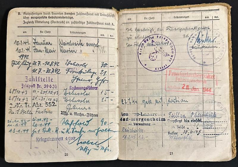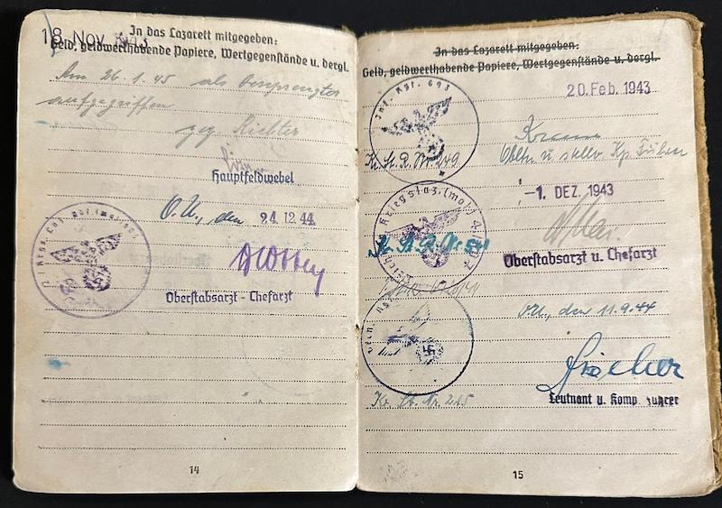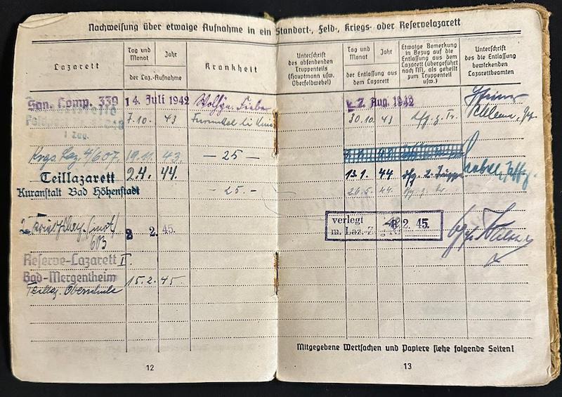 Wounded won the 8.2.1945 – Hospital – 26.5.1944 , Bad Höhenfels moved with hospital train to Bad Mergntheim.