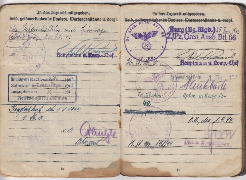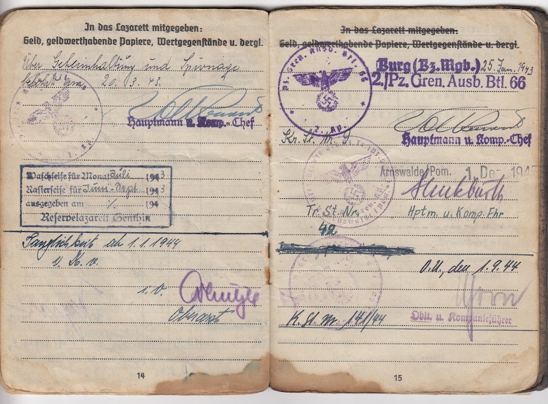 Awards: Iron Cross Second Class, Wounds Badge in Black, Panzer Assault Badge in Bronze, Eastern Front Medal.