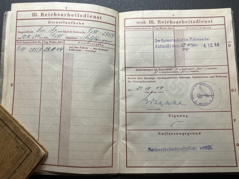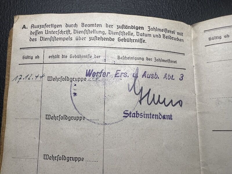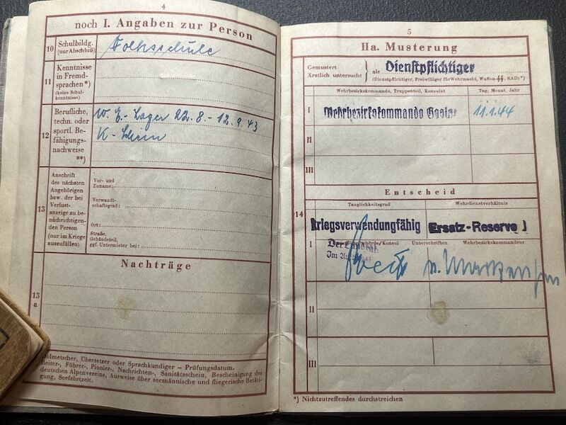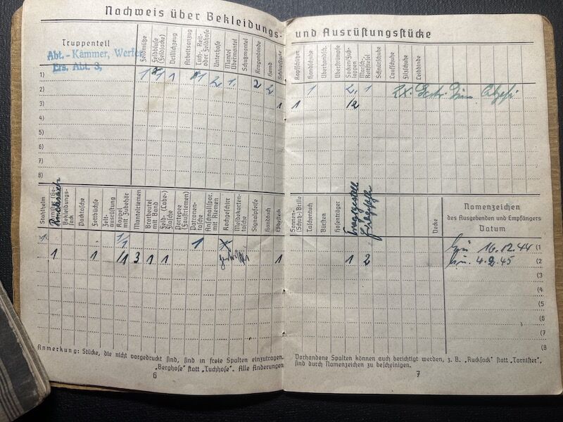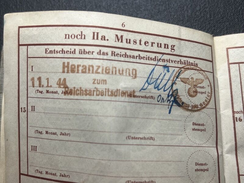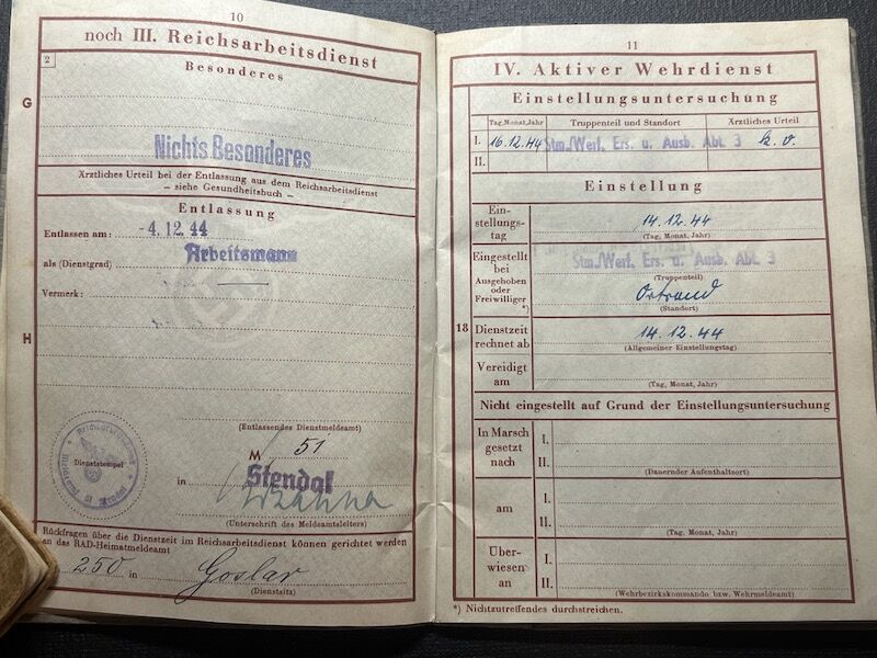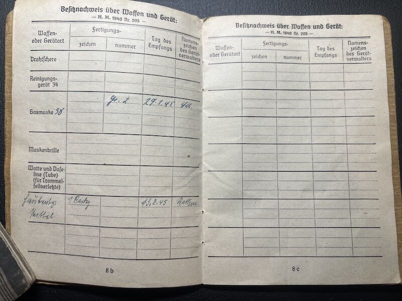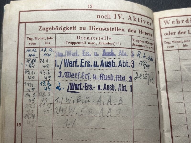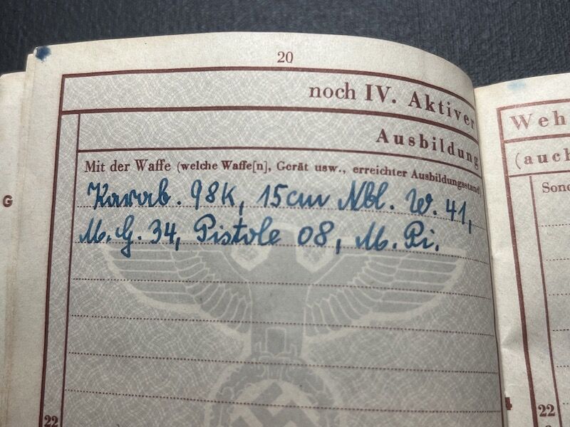 He was enlisted into a Werfer training unit, where he was trained on the 98K Rifle, 15cm Nebelwerfer 41, MG34, Luger P08 and the Machine Pistol.