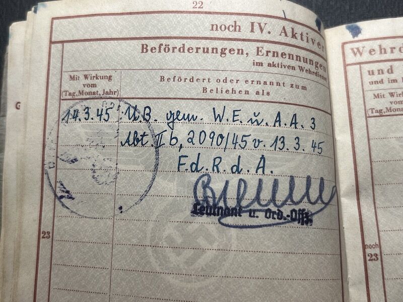 He was promoted on the 19.3.1945 as a RUB – Reserve–Unteroffizierbewerber – an NCO candidate.