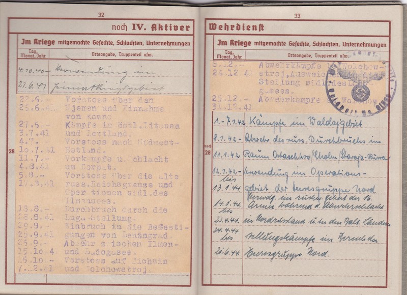 He has an impressive battle calendar, clearly he was with Heeresgruppe Nor, he was awarded the Eastern Front Medal, and managed to get out from the Kurland Pocket early enough to make it back to Germany.