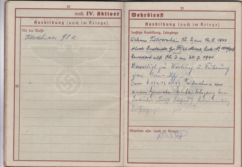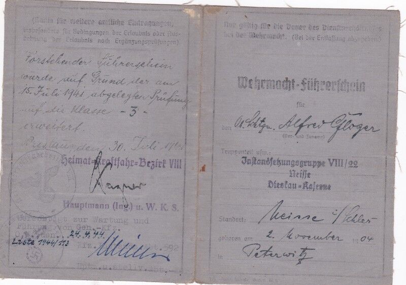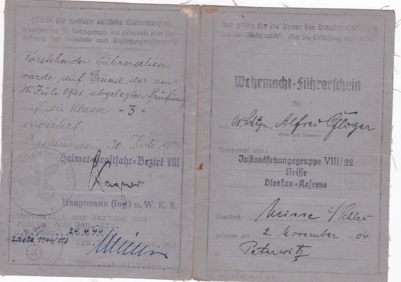 WWII German Wehrmacht Wehrpass ID & Wehrmacht Führerschein – Stabsgefreiter Alfred Gloger – Wehrmacht Driver with Drivers Licence