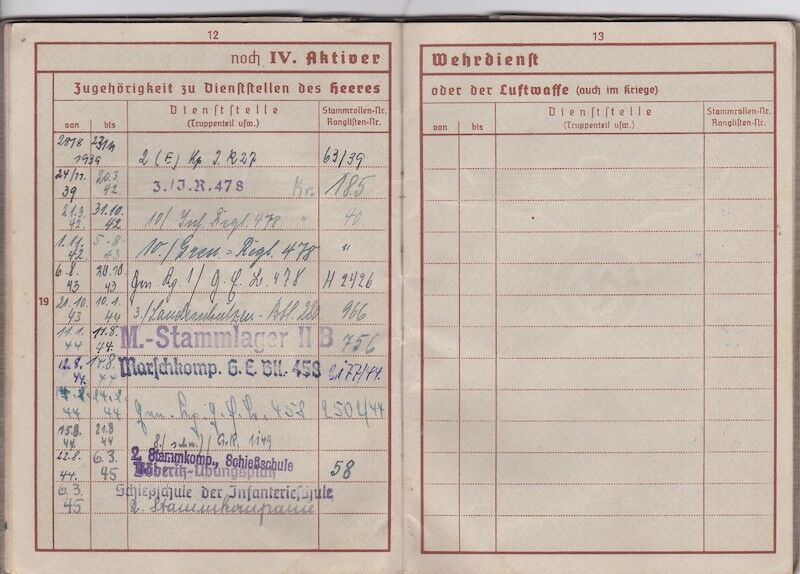 WWII German Wehrmacht Wehrpass – Obergefr Ehmcke – Grenadier Regiment 478 (Wounded in Operation Citadel) – Döberitz- Infanterie Schule/Berlin 1945