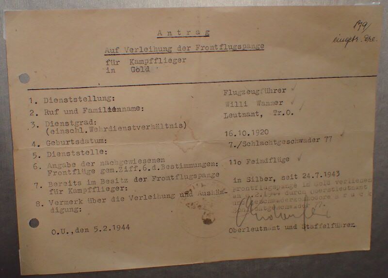 WANNER, Willi. 01.06.44 promo to Oblt./A1. 27.07.44 Oblt., 7./SG 77 MIA – Ju 87 D-5 (S2+CR) shotdown by AA vic Bialystok.