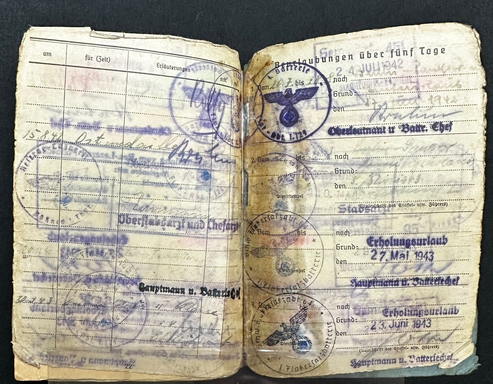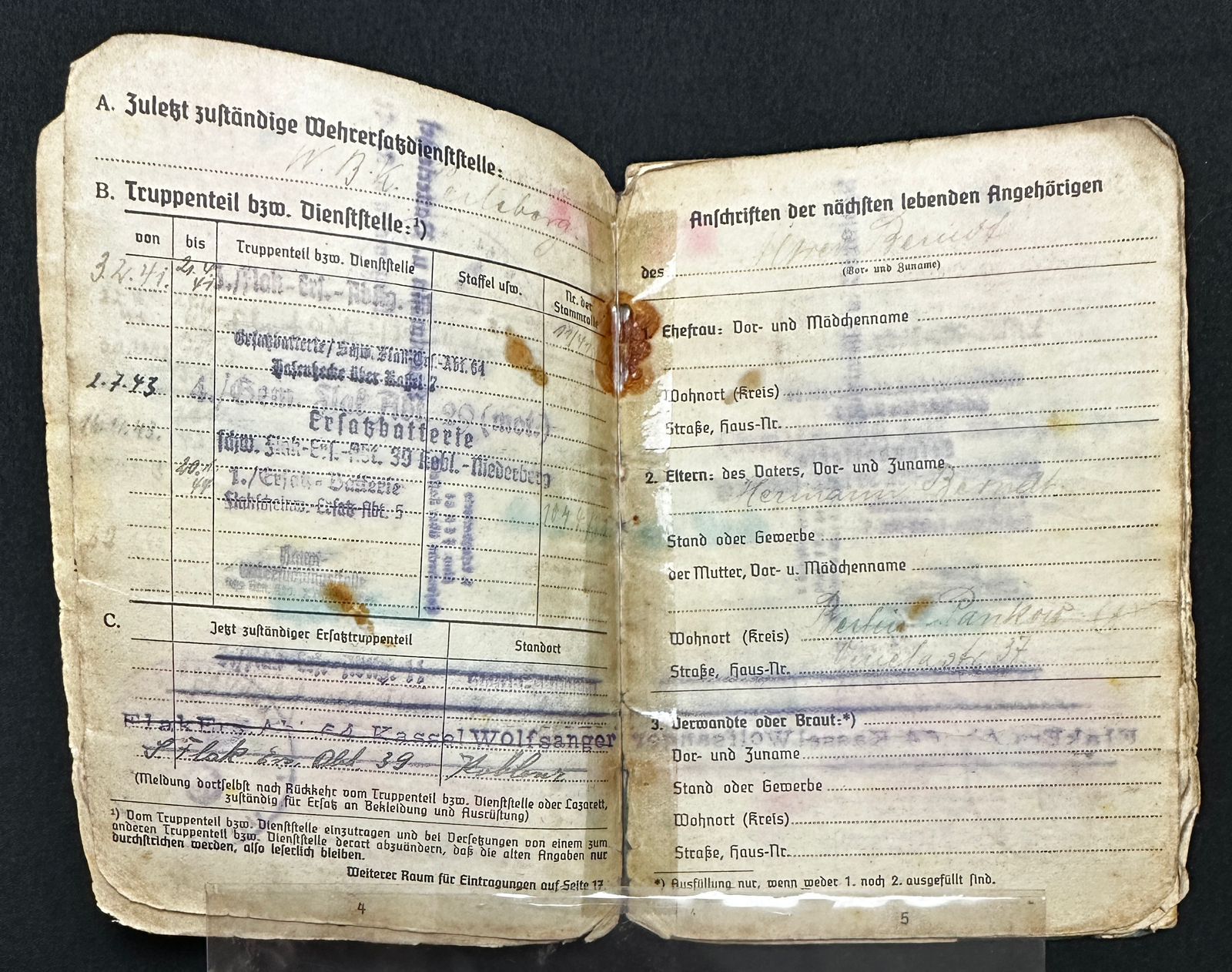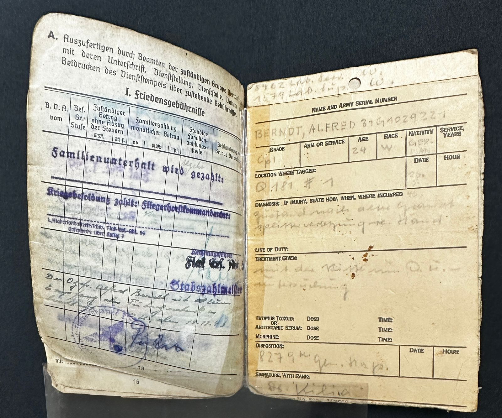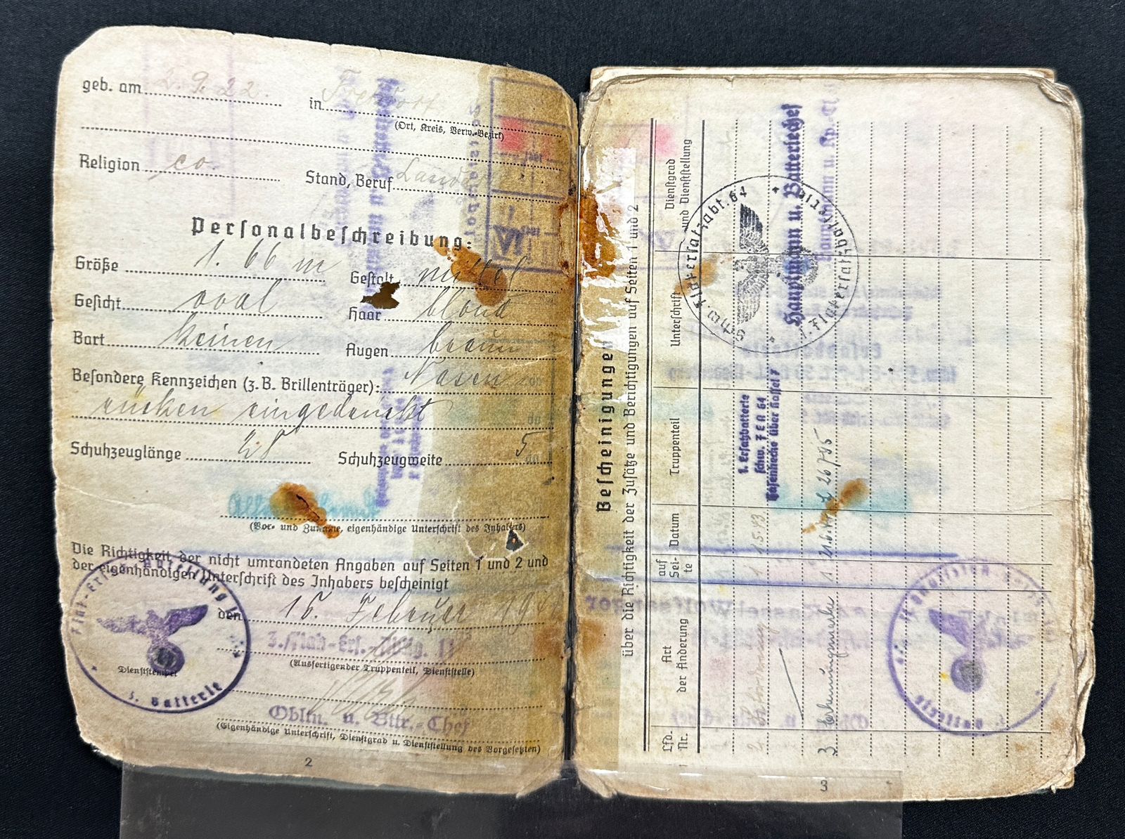 The Soldbuch is not in the best condition, but it was there. A highly desirable unit, and he was an experienced Flak Soldier. He was captured by US Troops, woulded by a grenade fragment in the right hand. His Photo was stapled again but its the original photo from the Soldbuch.