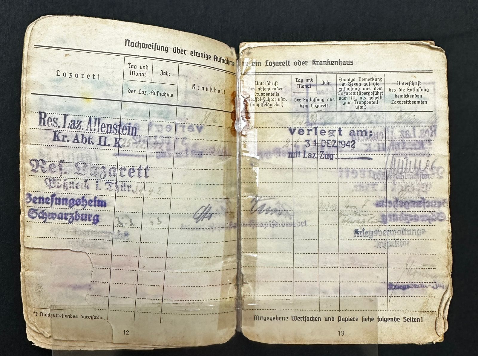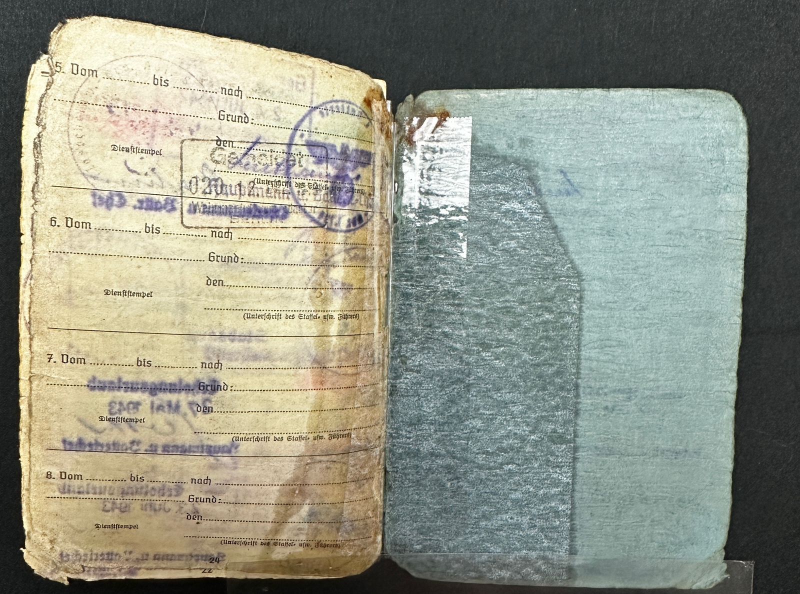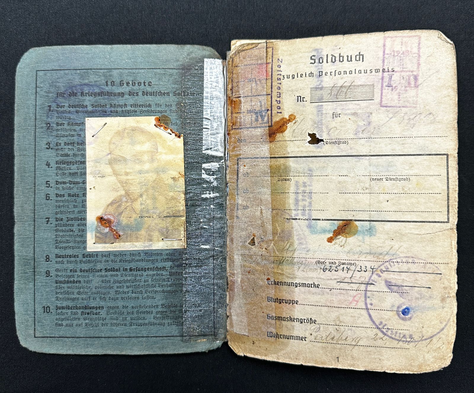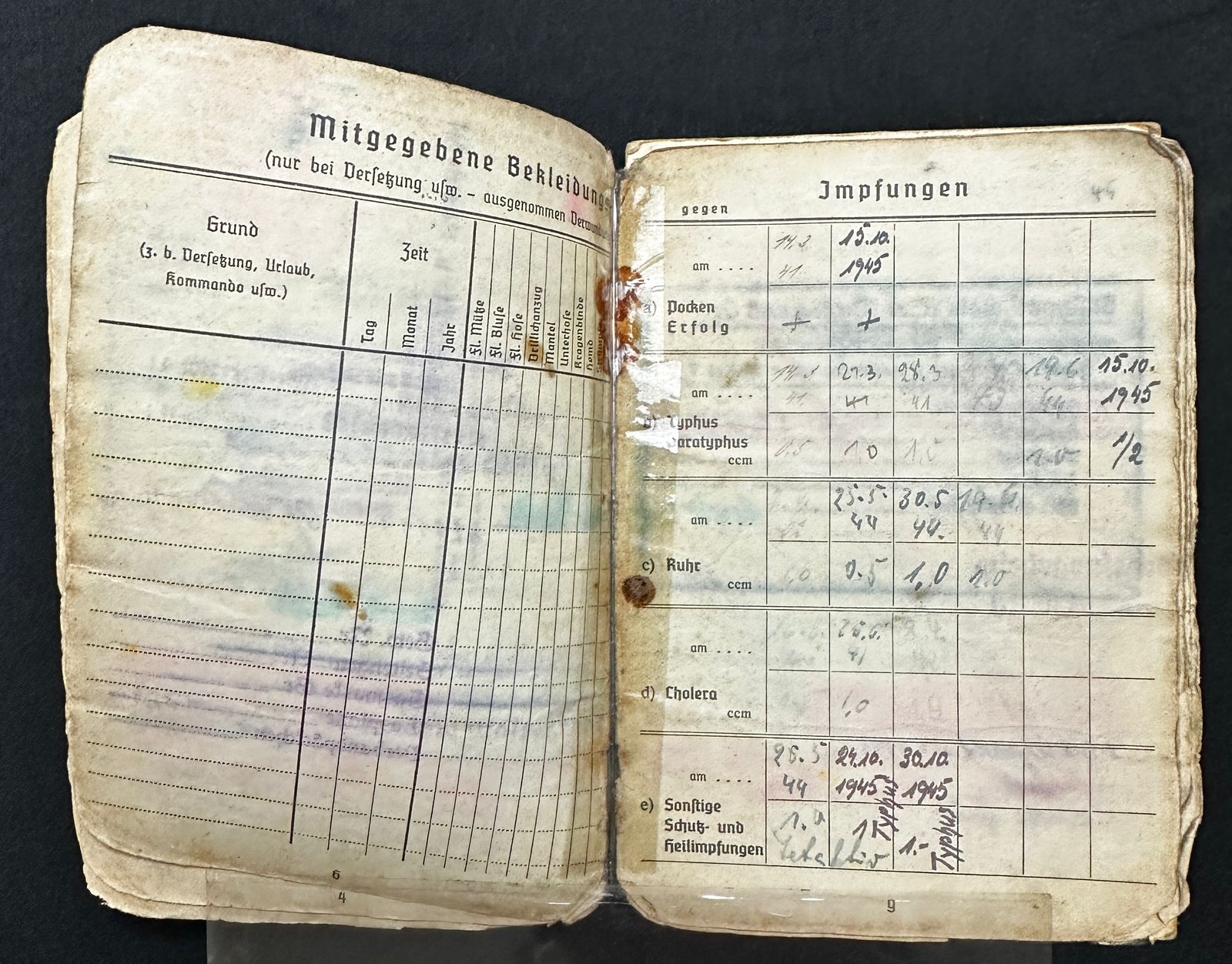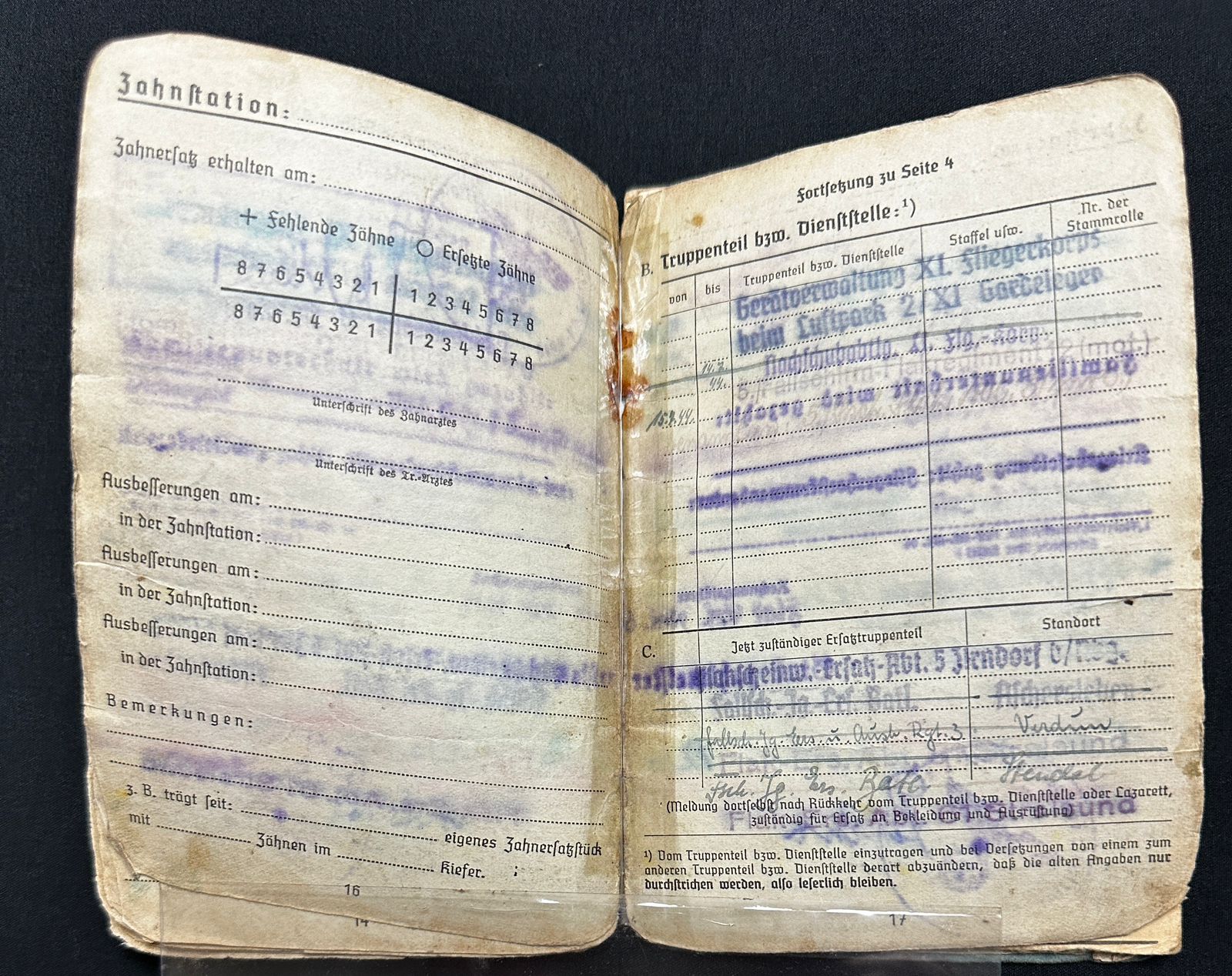 The Soldbuch is not in the best condition, but it was there. A highly desirable unit, and he was an experienced Flak Soldier. He was captured by US Troops, woulded by a grenade fragment in the right hand. His Photo was stapled again but its the original photo from the Soldbuch.