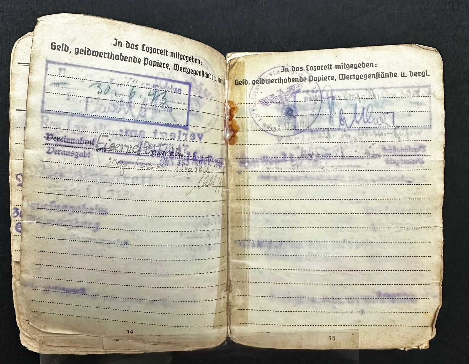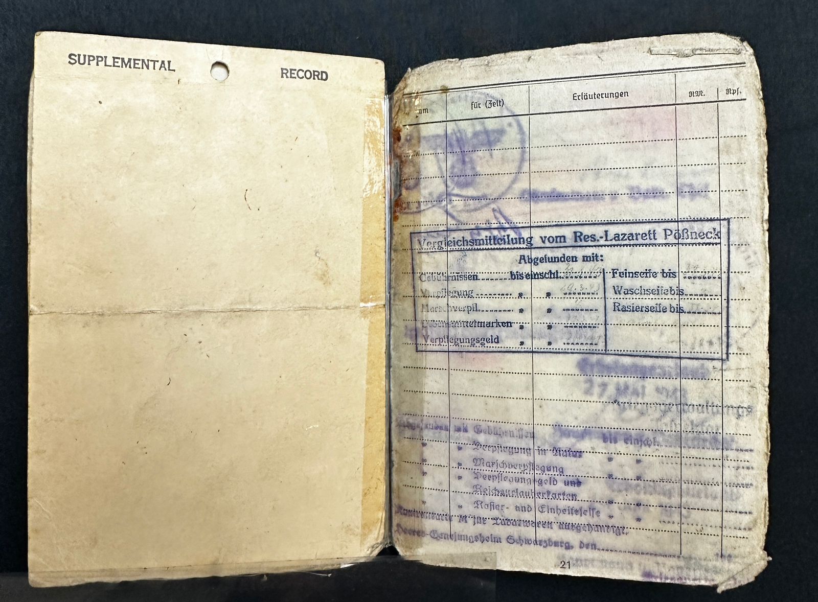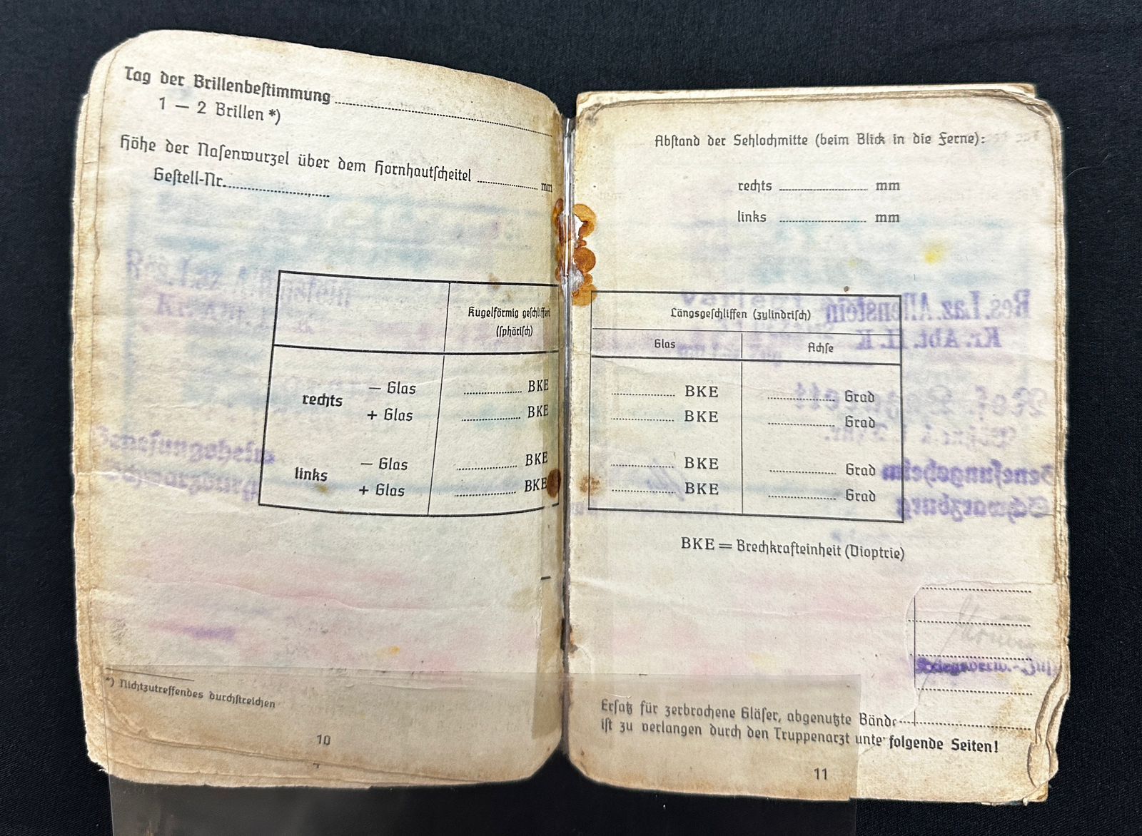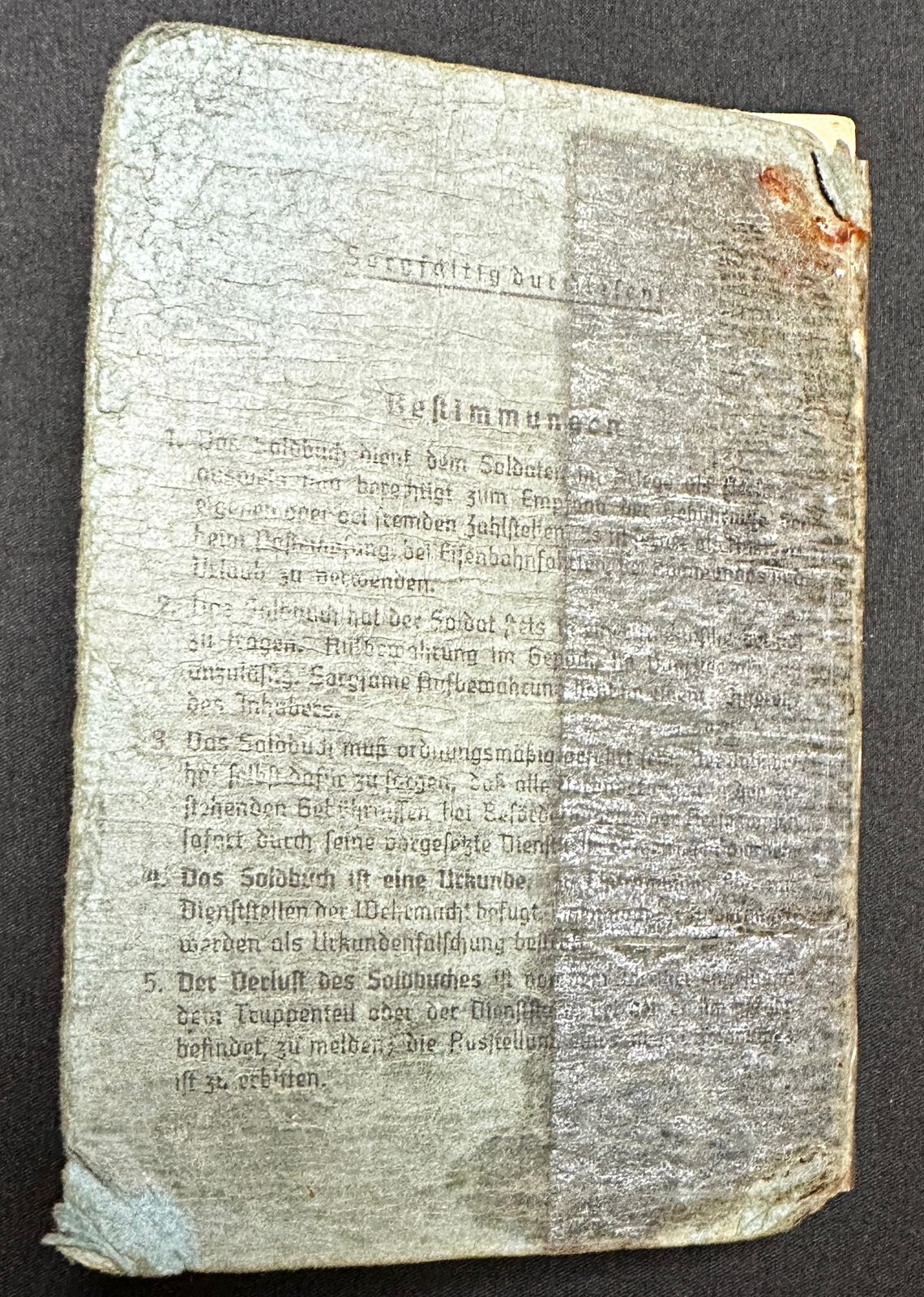 The Soldbuch is not in the best condition, but it was there. A highly desirable unit, and he was an experienced Flak Soldier. He was captured by US Troops, woulded by a grenade fragment in the right hand. His Photo was stapled again but its the original photo from the Soldbuch.