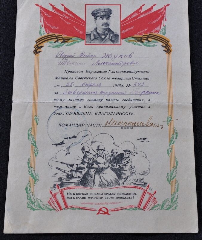 WWII Red Army Certificate for the Capture of Berlin – Major Zhukov – IS2 & SU76 Tanks – Reichstag Battle – Rare Researched