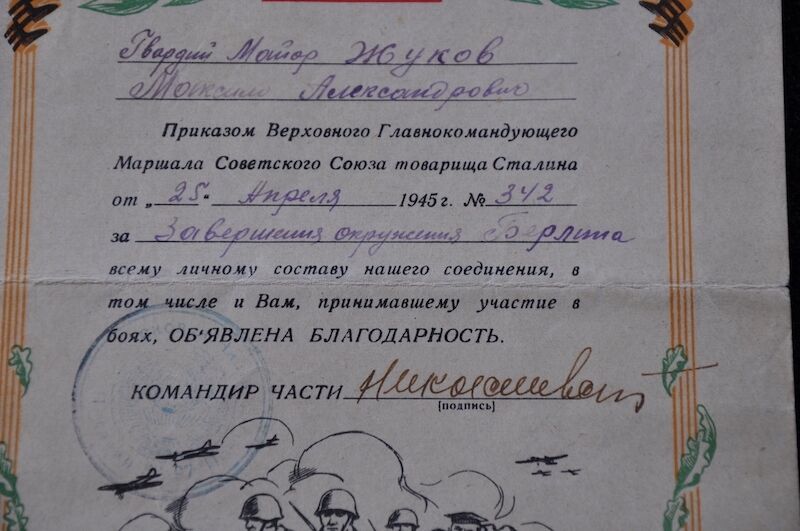 Detailed descriptions online of the Majors actions in Germany in 1945. He also had many awards, including the Order of Suvorov and the Order of the Red Banner.