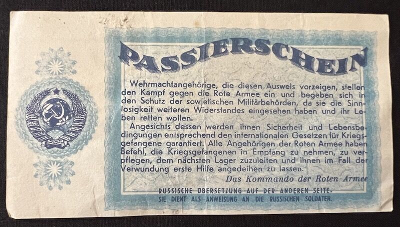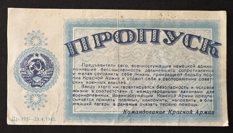 A very late pass to surrender to the Red Army, made in the form of a bank note to capture attention. Very late war (23.04.1945) perhaps used during the battle for Berlin 1945.