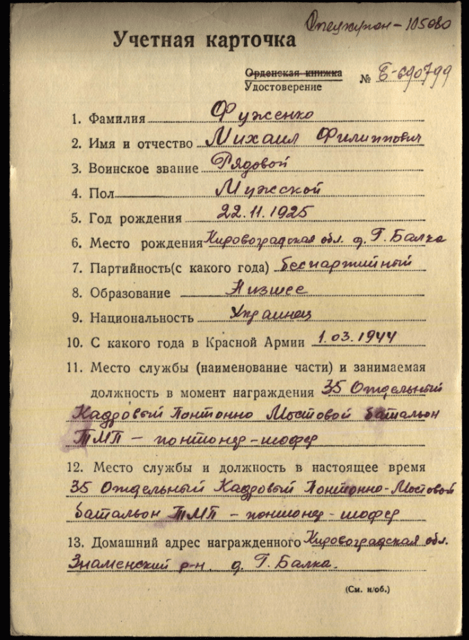 Fuzhenko, an active participant in the Great Patriotic War since June 1944 in the position of a loading gun of the 1323th anti-tank artillery regiment, 2 separate anti-tank artillery brigade, was slightly wounded – a blind shrapnel wound to the left shoulder blade, near the city of Jassy, Romania. He was wounded for the second time near the city of Bratislava on April 5, 1945 – a slight blind shrapnel wound to the lower third of the left lower leg. The injuries did not interfere with a good work.