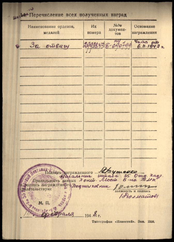 Fuzhenko, as part of the gun crew, actively participated in the battles for the capture of the city of Jassy, Romania. Participated in the crossing of the rivers Gron, Vag. As an active participant in the Patriotic War, he deserves to be awarded the medal “For Courage”.