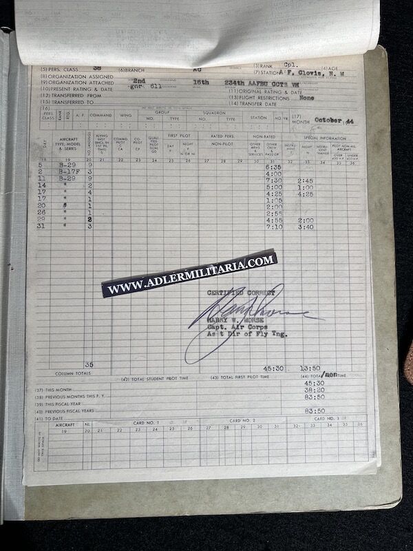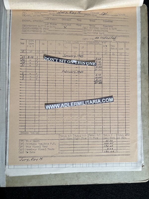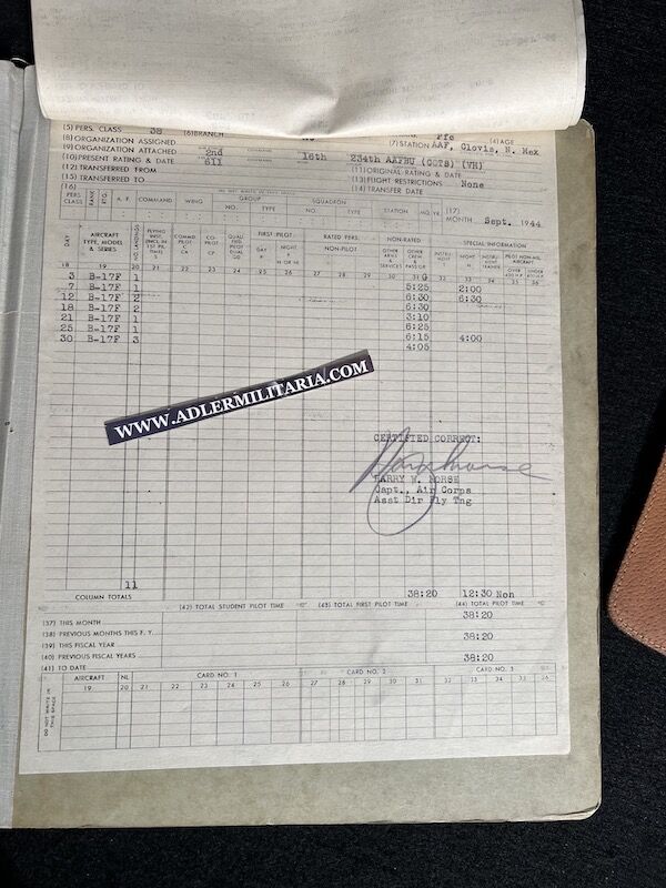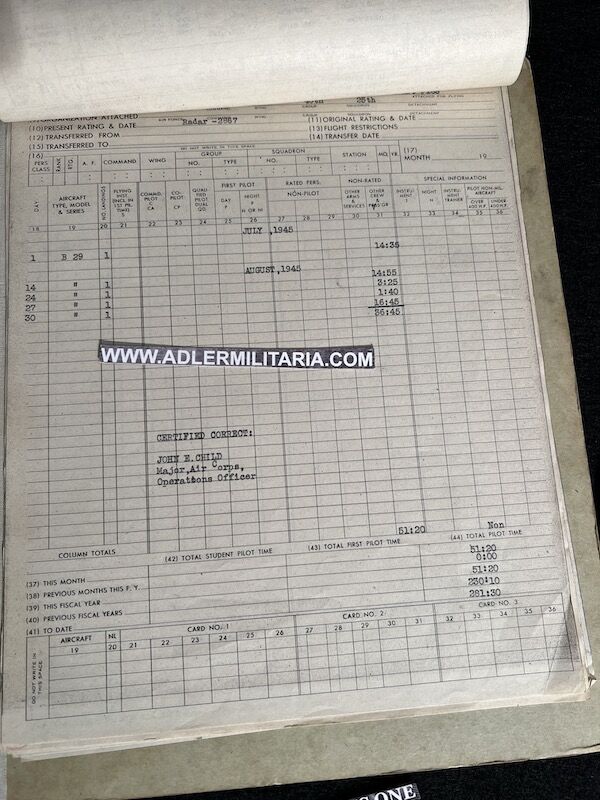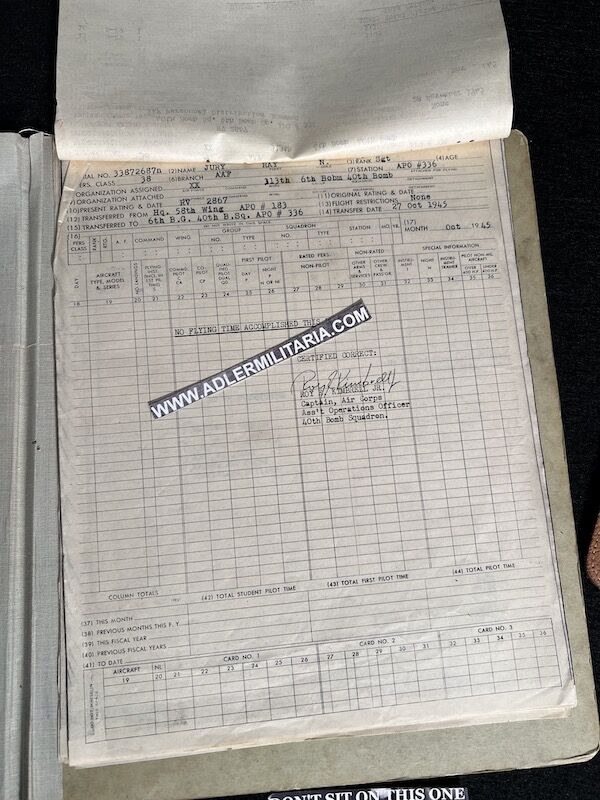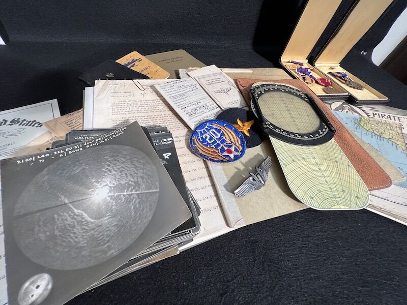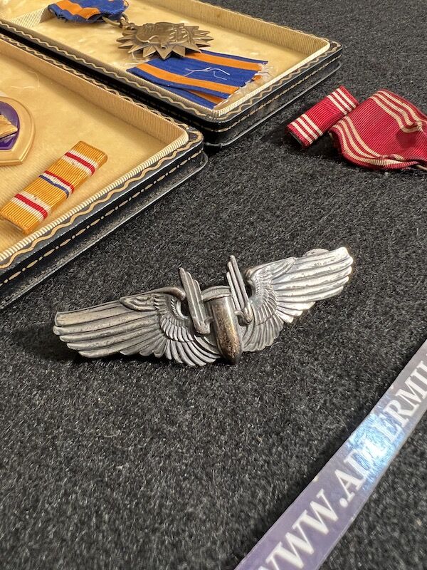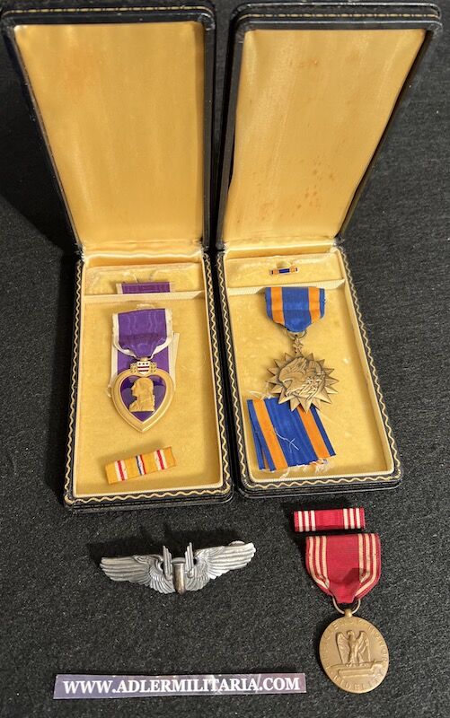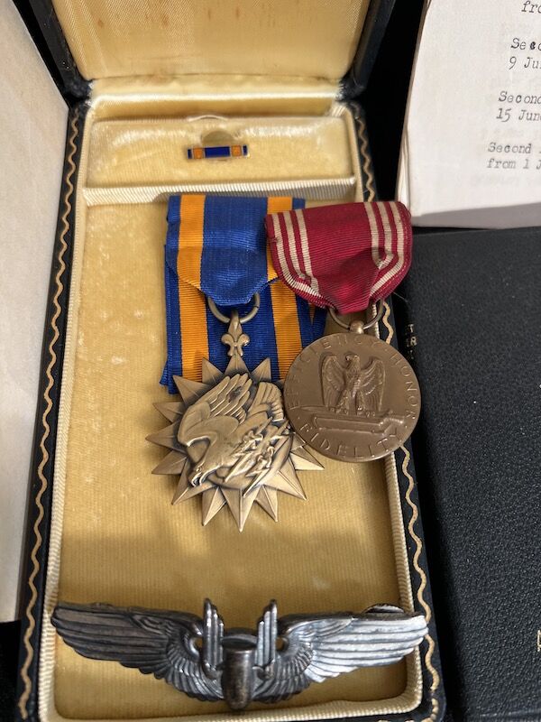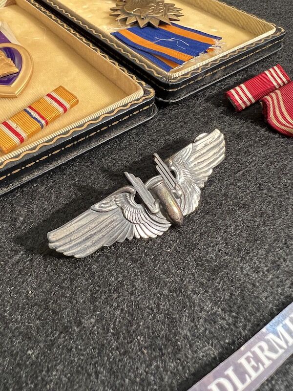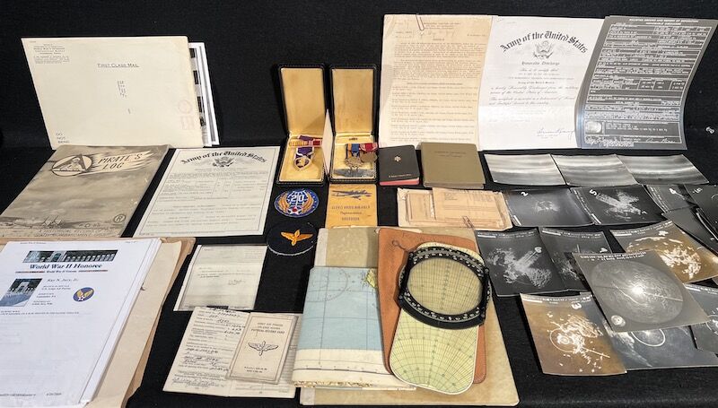 The grouping has all his combat flight logs and his blind flying instrument. As well as his Purple Heart and his Air Medal boxed.