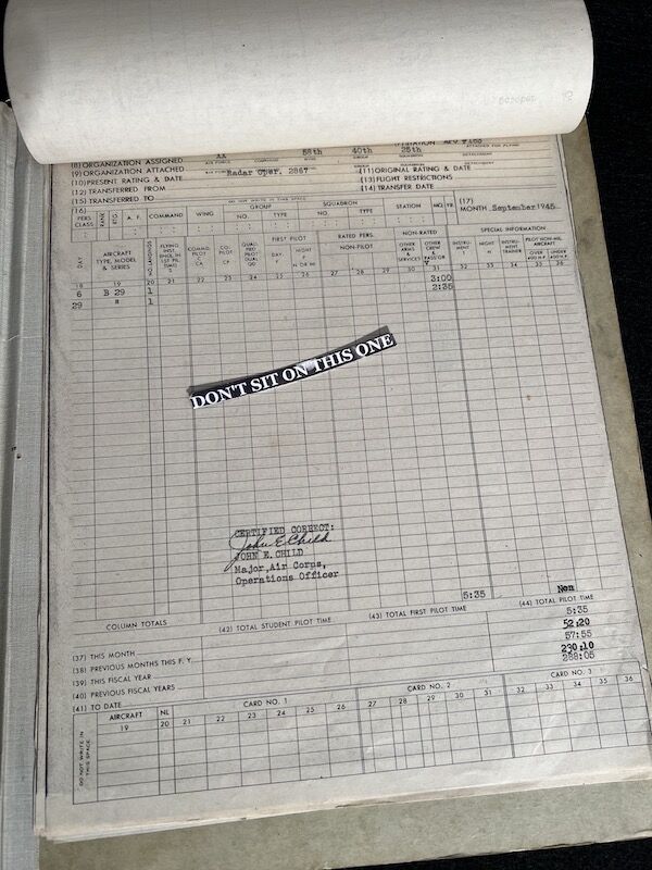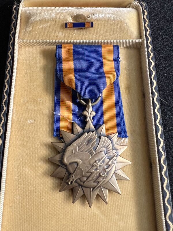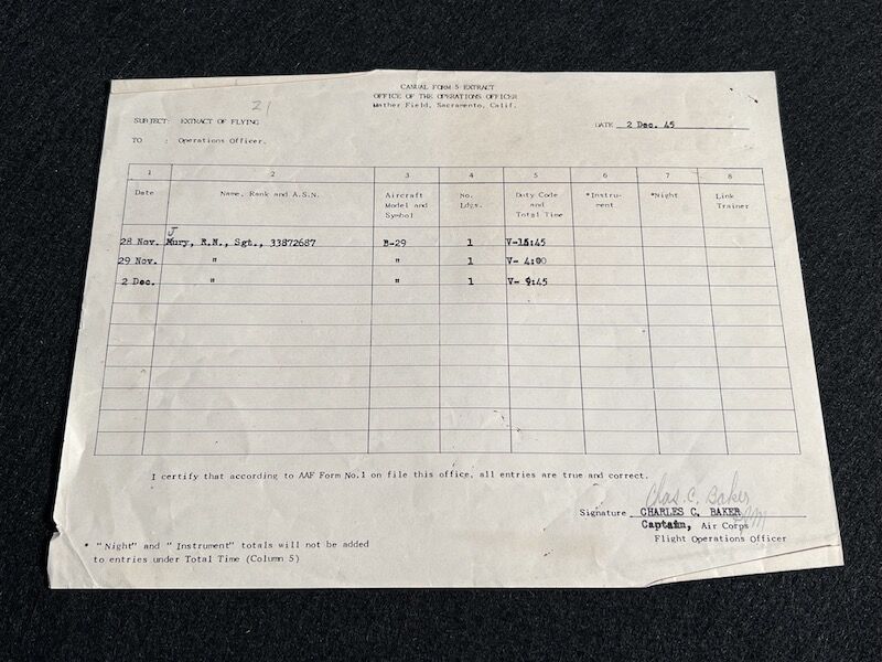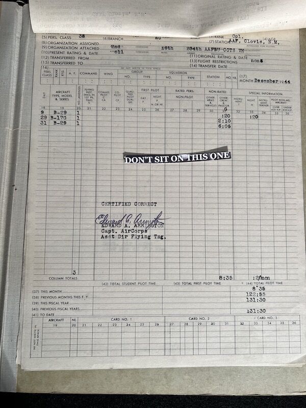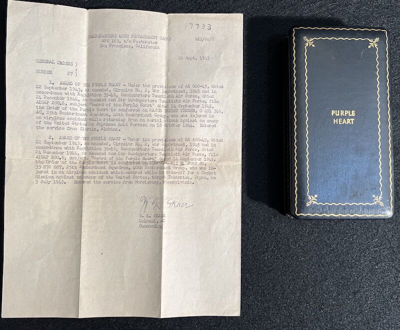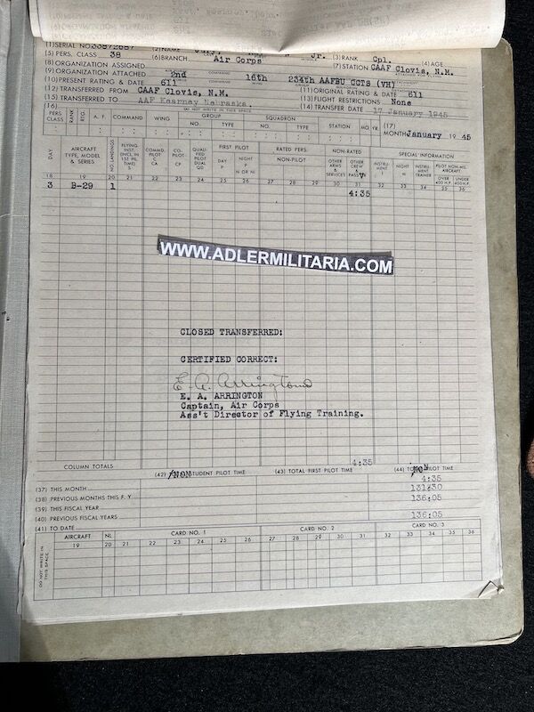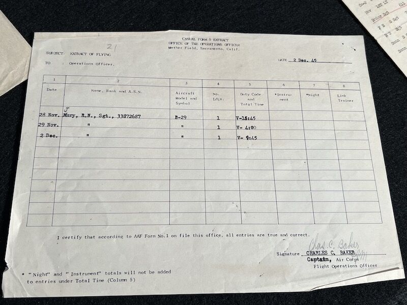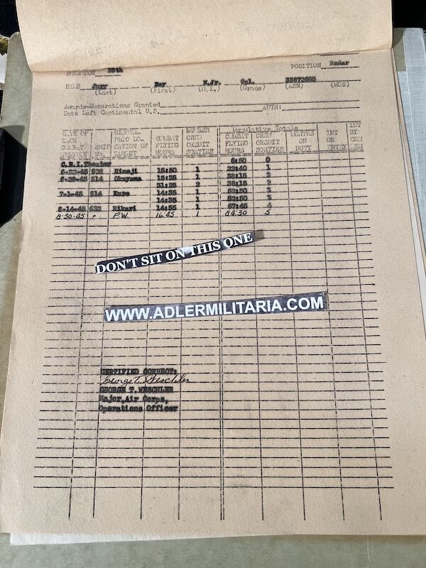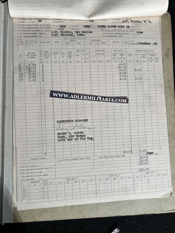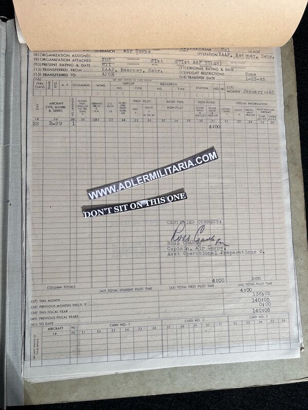 The grouping has all his combat flight logs and his blind flying instrument. As well as his Purple Heart and his Air Medal boxed.