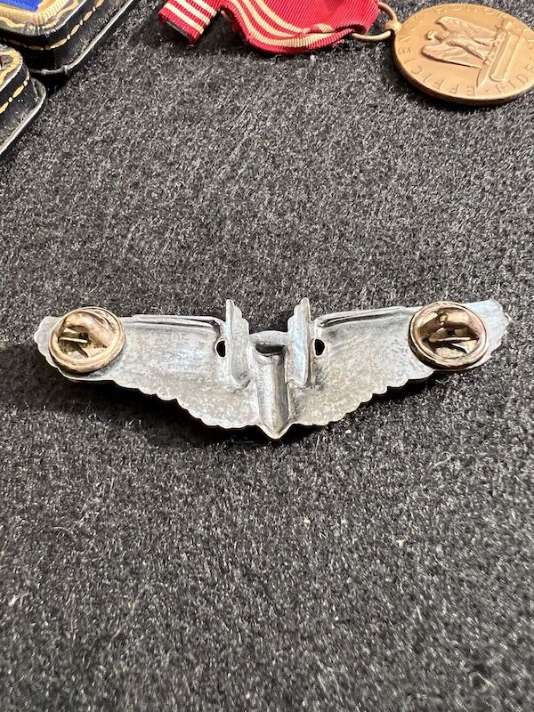 His Wings are Sterling Silver, his Purple Heart is not named but it has his period print out with him listed. It seems he was awarded it for a crash on take off on a combat mission.