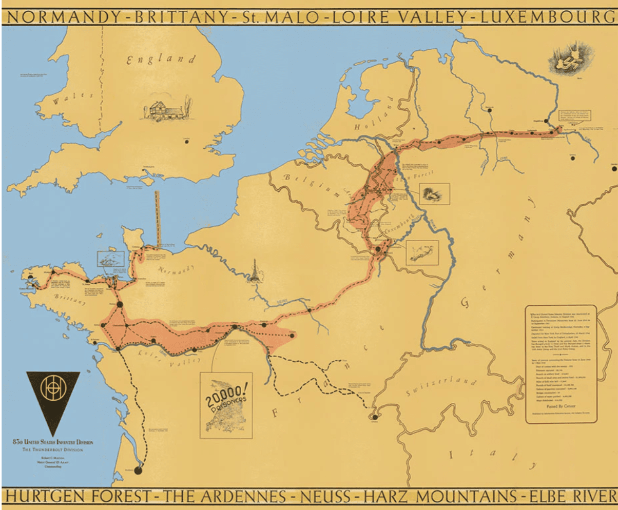 The 83d Infantry Division arrived in England on 16 April 1944. After training in Wales, the Division landed at Omaha Beach, 18 June 1944, and entered the hedgerow struggle south of Carentan, 27 June. Taking the offensive, the 83d reached the St. Lo-Periers Road, 25 July, and advanced 8 miles against strong opposition as the Normandy campaign ended.