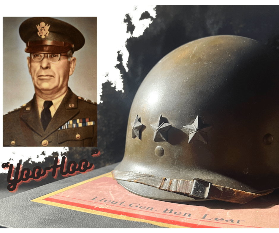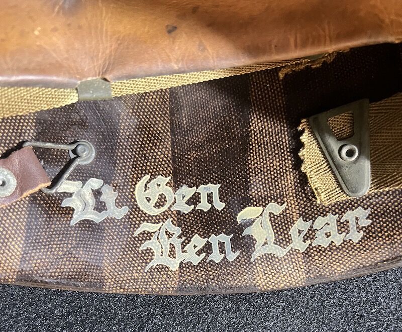 The Helmet – It is clear that Lear was not keen on wearing his steel pot, applying his three stars on his M1 Helmet Liner for wear. A Westinghouse M1 Liner Named: “Lt Gen Ben Lear” with Three General Stars neatly added.