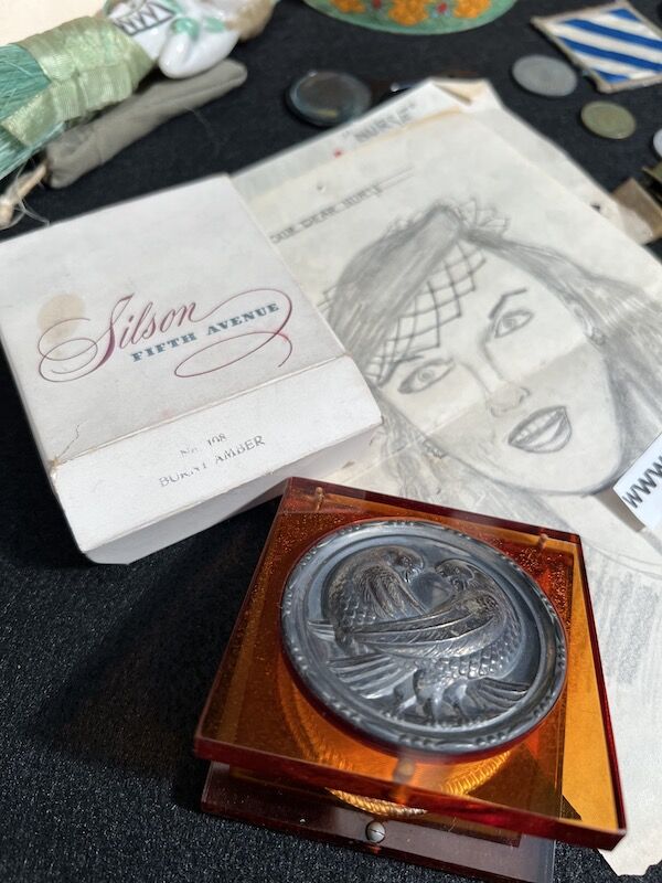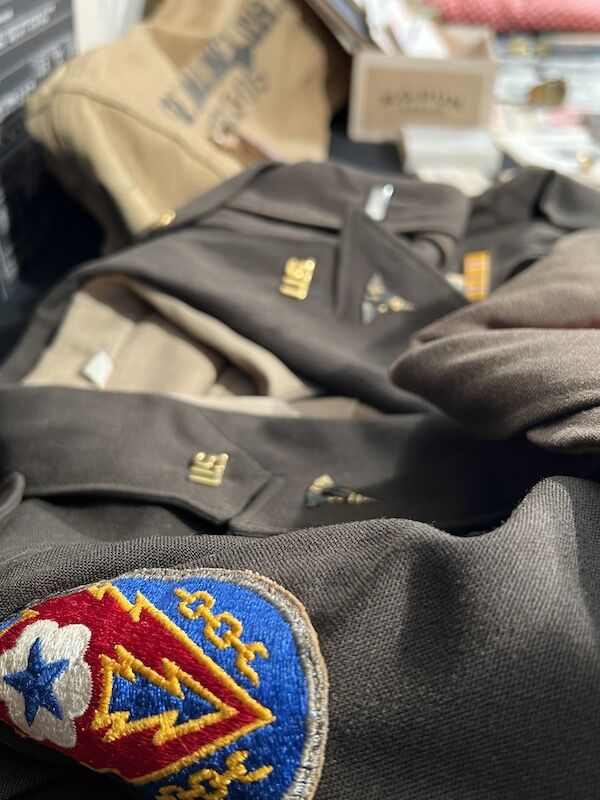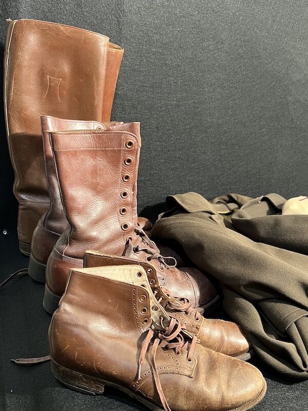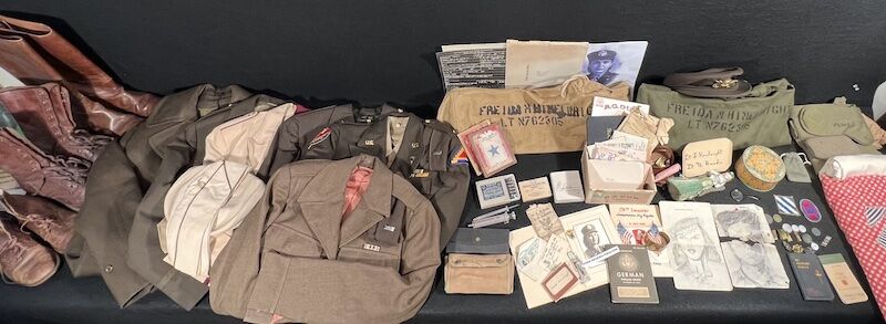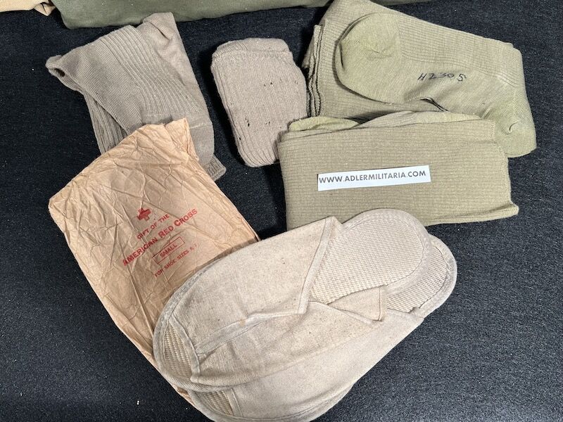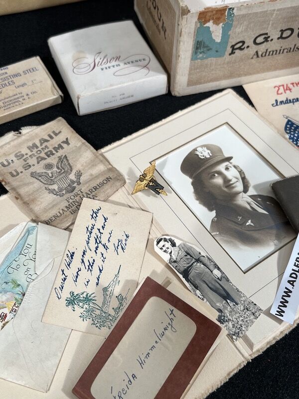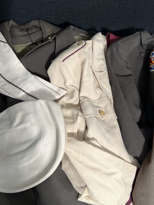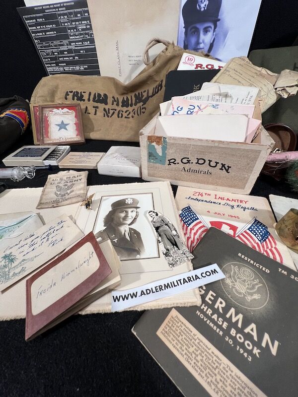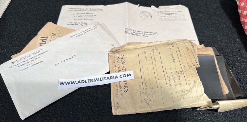 Further Uniform items include: WAC Overseas Garrison Cap with Rank and Nurse Branch Insignia, WAC Overseas Cap Chocolate Brown, WAC Doeskin Overcoat by ‘Schwartz Cincinnati’, Service Uniforms Chocolate Brown ‘Jacket Service Tropical Worsted Nurses Dark OD 10R Lyonelle Modes Dated May 1944’, Khaki Shirt & Tie, WAC Skirt with stitched laundry number, & White Uniform Jacket with 7th Army SSI Shoulder Patch and 2 Overseas Service Bars ‘Mary Sachs Tailors Harrisburg’, White WAC Officers Hat by KNOX, Khaki Tie, Two White Garrison Caps, ‘Jacket Wool OD Women’s Officers 10S Giacobbe Brothers Dated Dec 1943’, White dinner jacket, Four Additional Skirts Including One 1945 Dated French Made, Low Quarter Leather Shoes, WAC leather boots, leather riding boots, and assorted socks and garments.