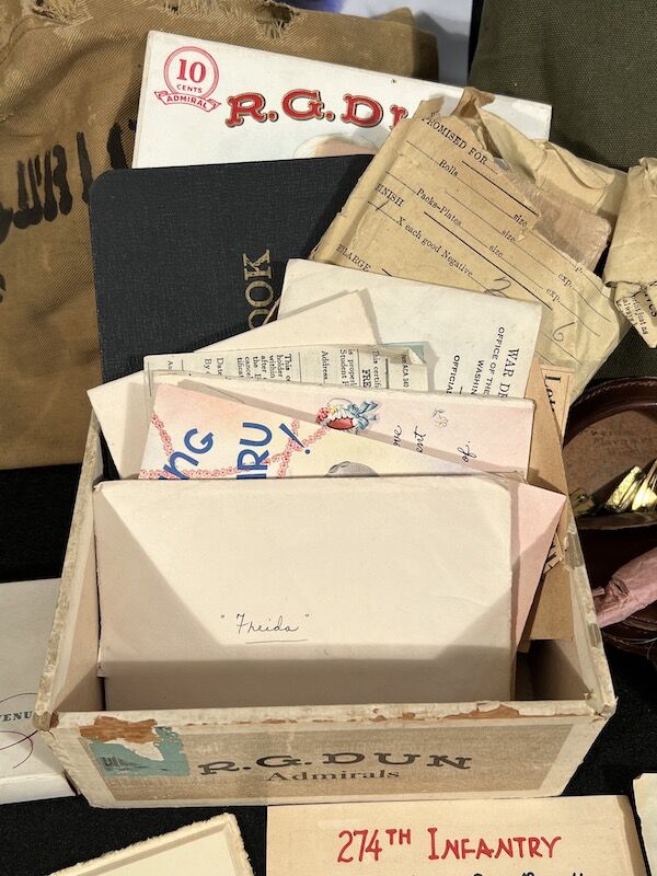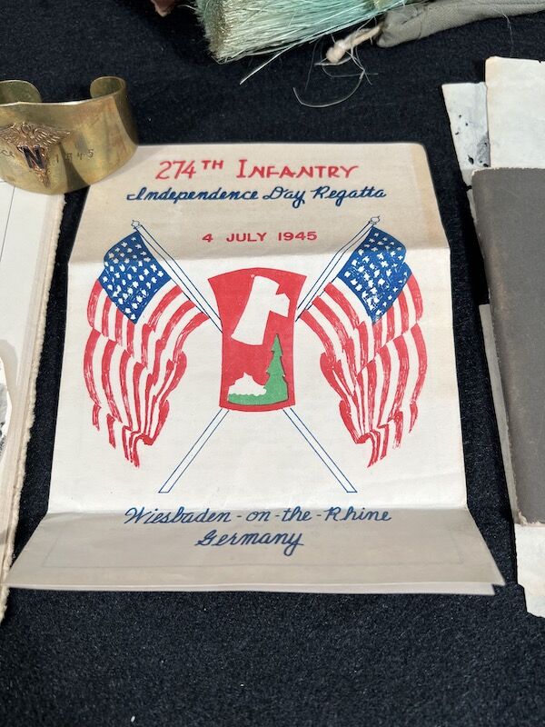 Various books and pamphlets: German Phrase Book 30-606, 274th Infantry Independence Day Regatta Wiesbaden on the Rhine Germany 4 July 1945, My Military Missel, USO Red Cross Pad, and small papers / letters.