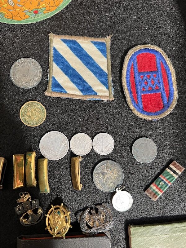 Assorted insignia and small items to include German Occupation made 3rd Infantry Division SSI Shoulder Patch, patches, coins, 2nd Lieutenant Rank Insignia Bars, Branch Army Nurse Corps Insignia, and other small personal pieces and patriotic items.