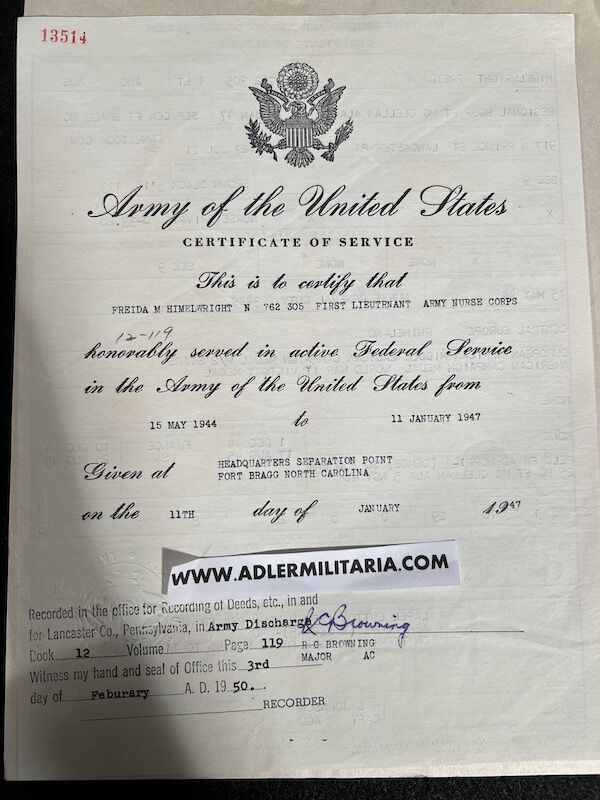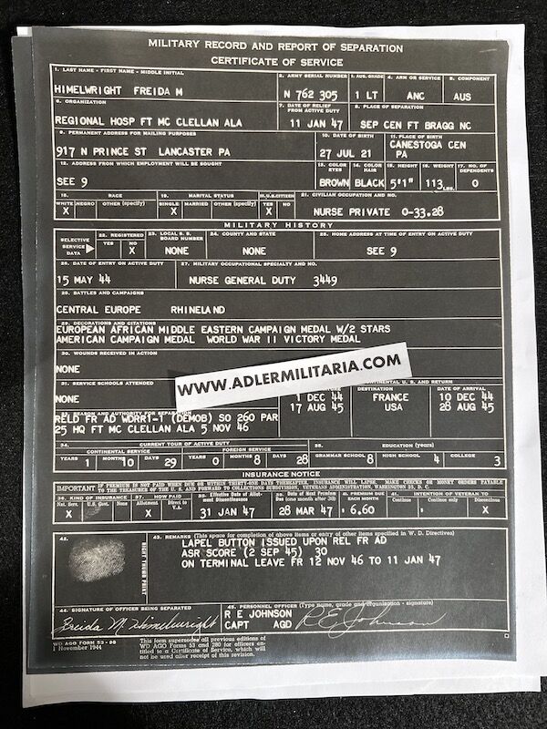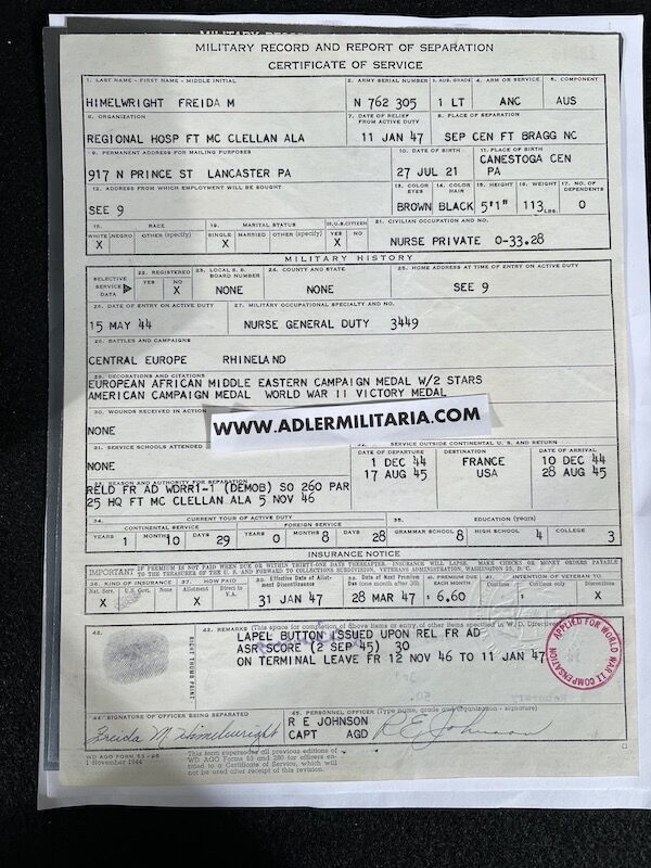 Wonderful Estate Collection of 1st Lieutenant Freida M. Himelwright N762305 who arrived 10 December 1944 in Europe and received Campaign Credits for Central Europe and Rhineland with the US Army Nurse Corps.
