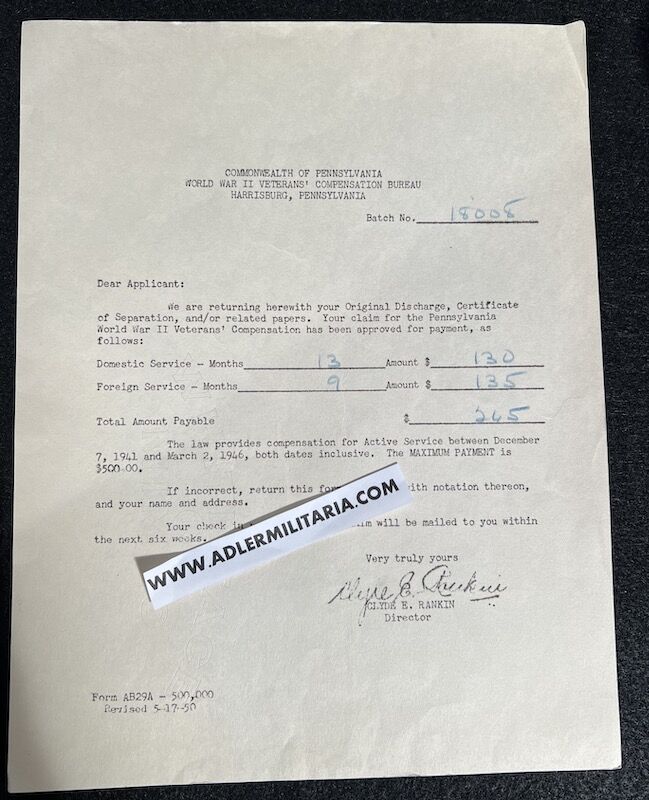 Documents: Military Record and Report of Separation Certificate of Service and Embossed Army of The United States Certificate of Service, Commonwealth of Pennsylvania Veterans Compensation, Department of Commerce Student Pilot Certificate 1946,