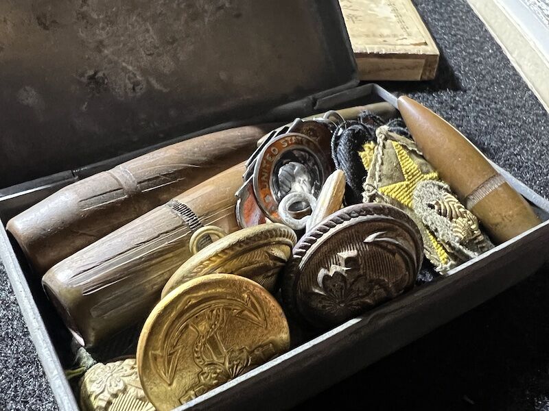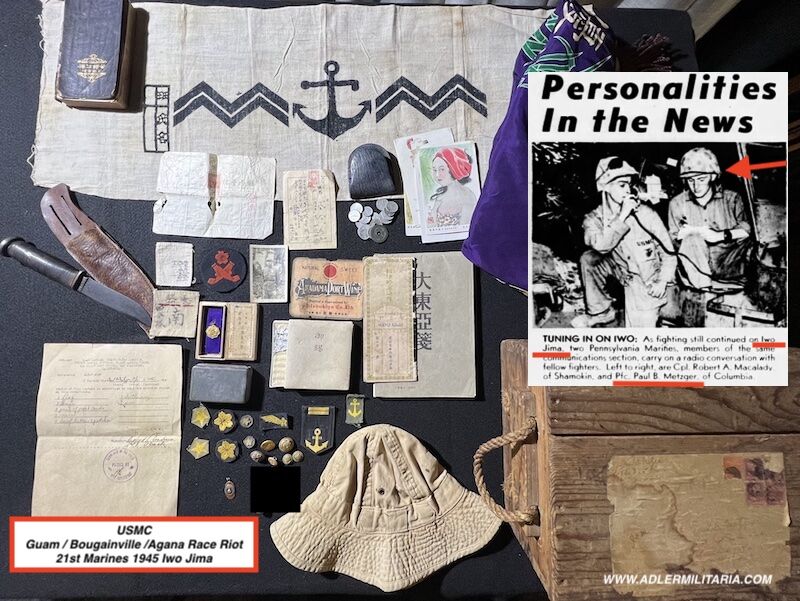 WWII US Marine Corps Trophy Box – Paul B Metzger – 3rd Marine Division – Bougainville – Guam – Agana Race Riot – 21st Marines – Iwo Jima – Japanese Trophy Flags – Insignia – Cut offs – Time Capsule