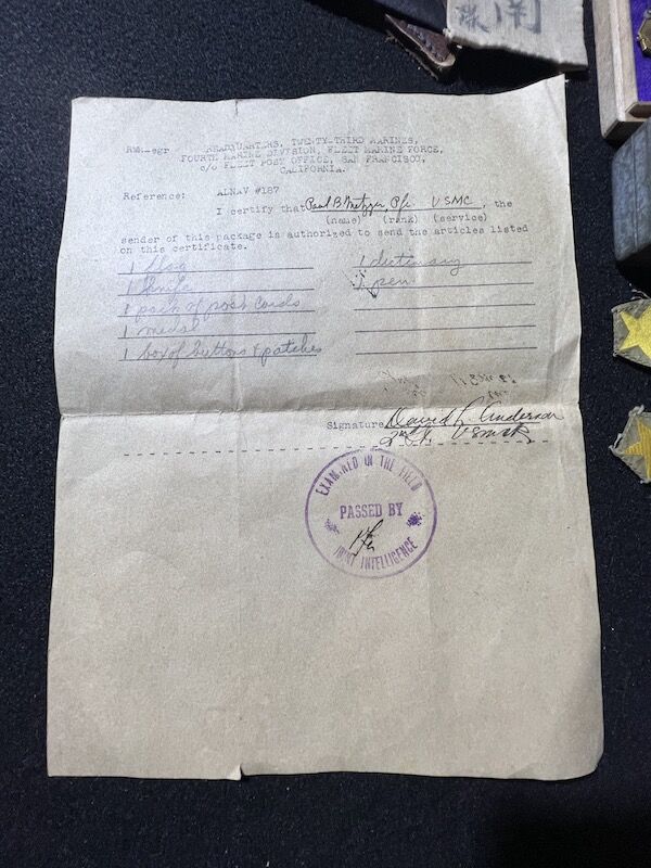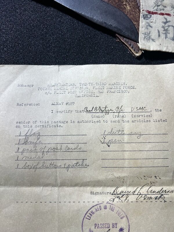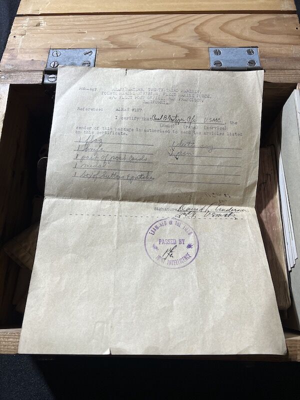 The then Private First Class Paul B Metzger sends his parents a Japanese Ammo Box, inside his throphies from his time in the following USMC units according to our research: