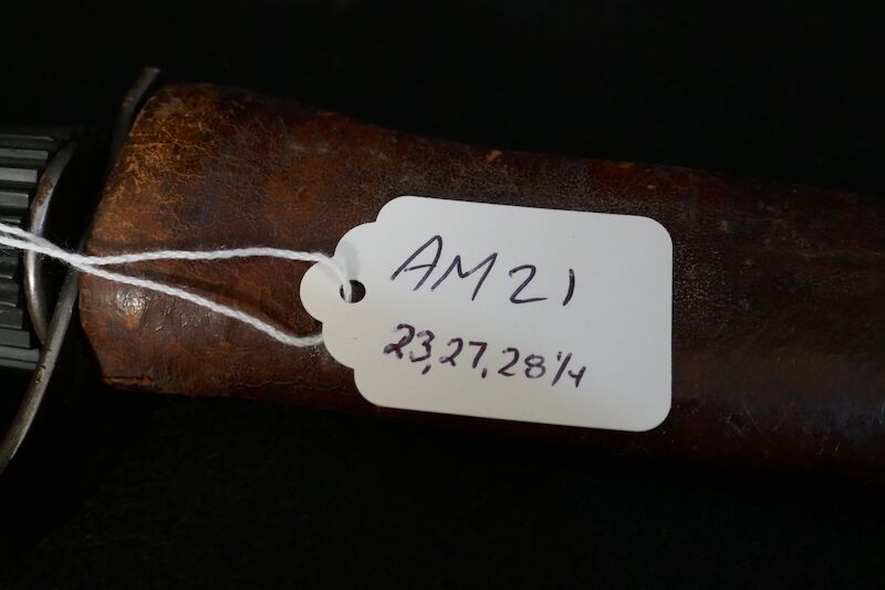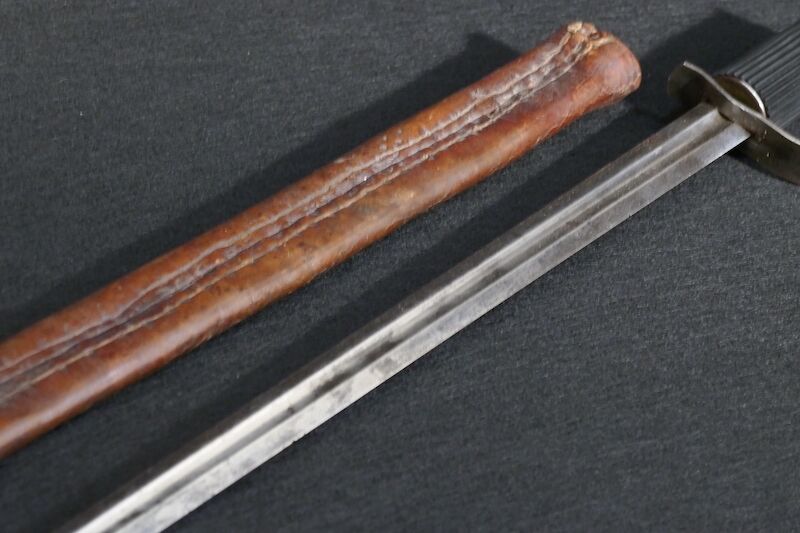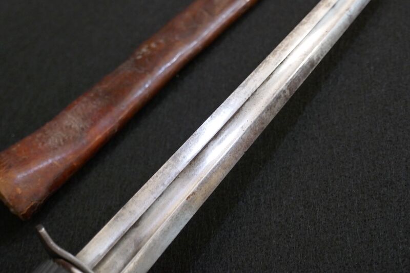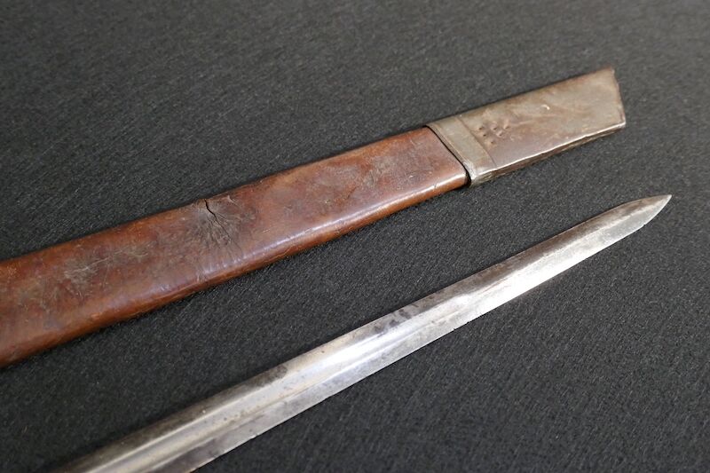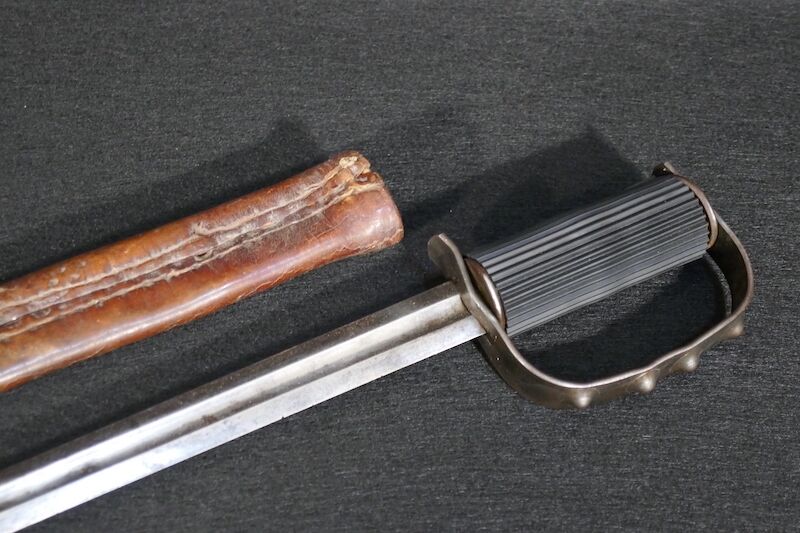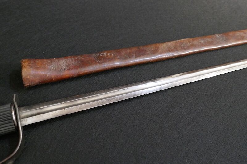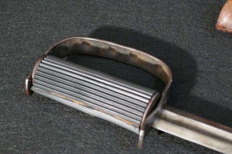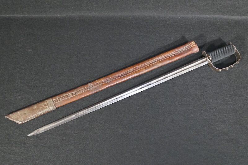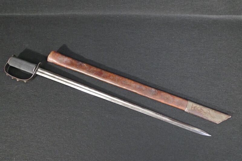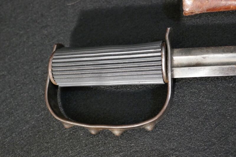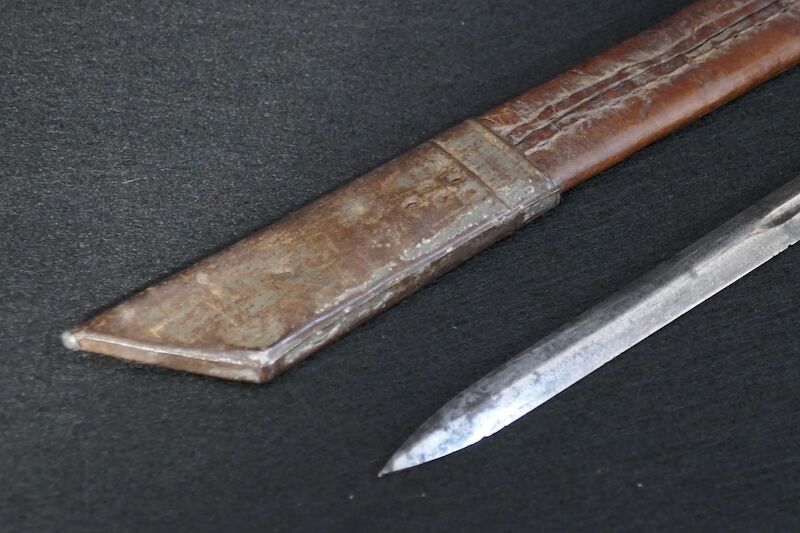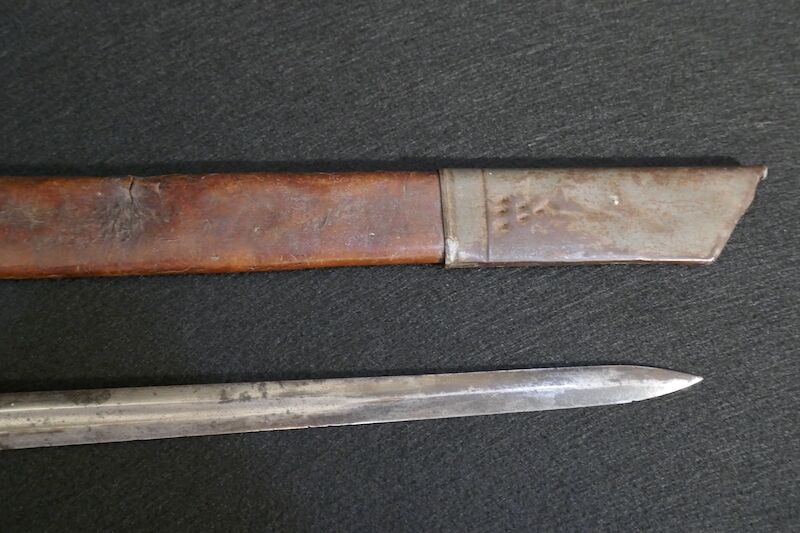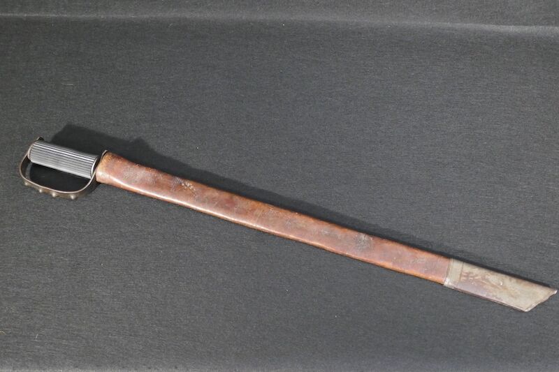 WWII US ‘Foster Bros.’ Contract OSS Drop Half Sword Fighting Knife M-1913 Patton Cavalry Sword Blade Repurposed for Construction, Insulated Handle, Knuckle Guard, and Philippine Guerrilla Leather Scabbard. M1913 Patton Straight Saber Point Tip Blade Segment with Fuller Measures 23 Inches, 27 Inches Pommel Cap to Tip, and 28 ¼ Inches Mounted in the Theater Made Scabbard.