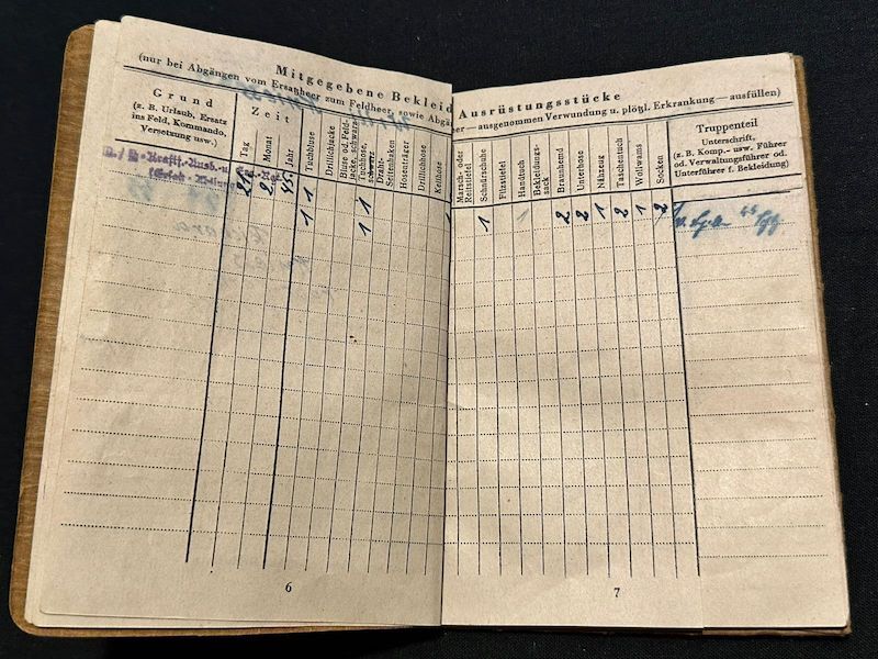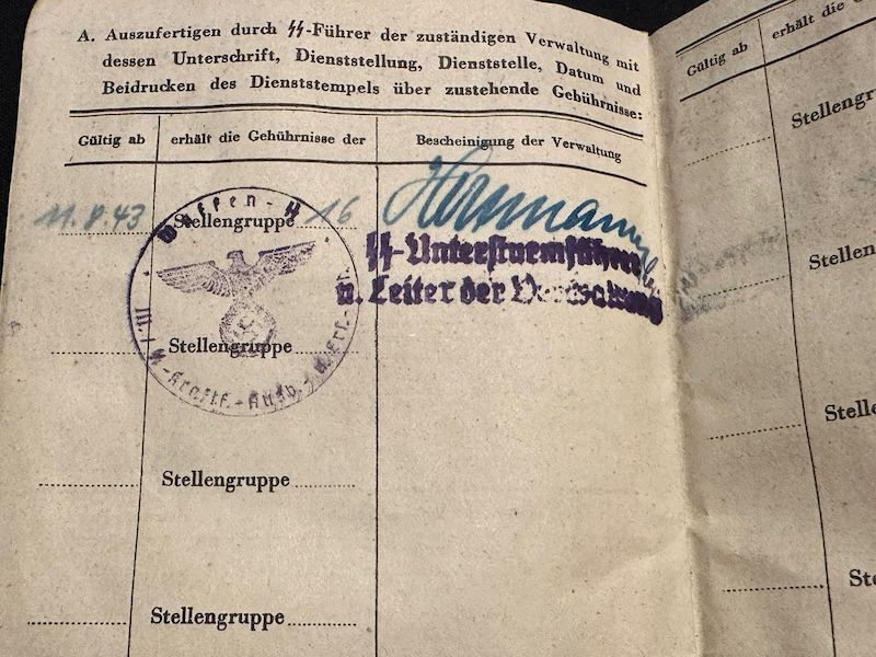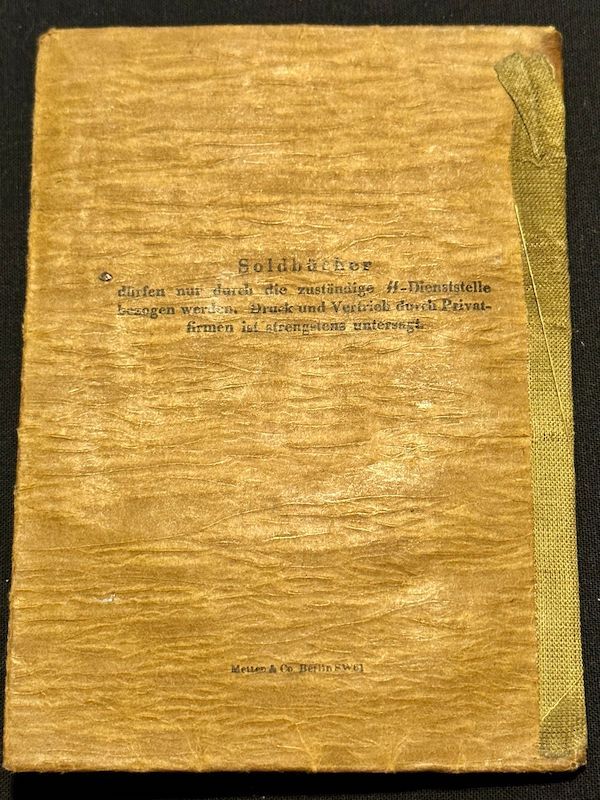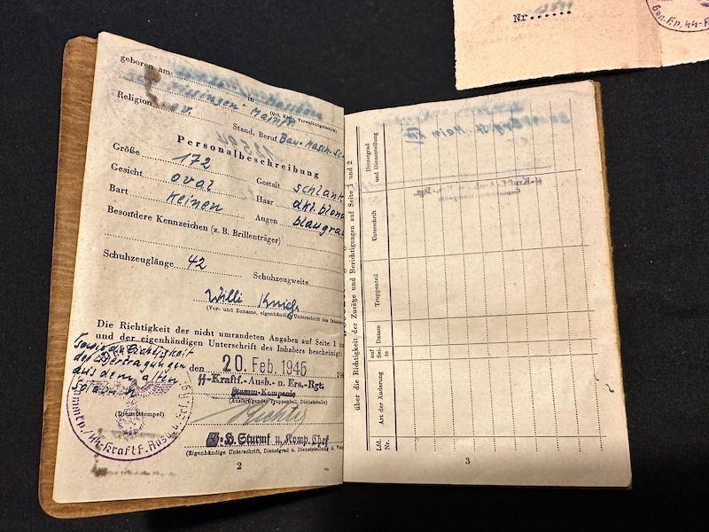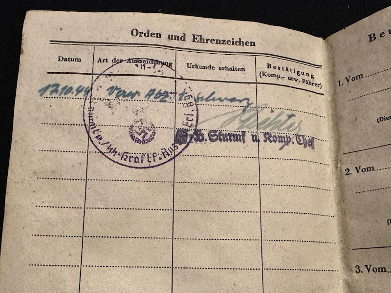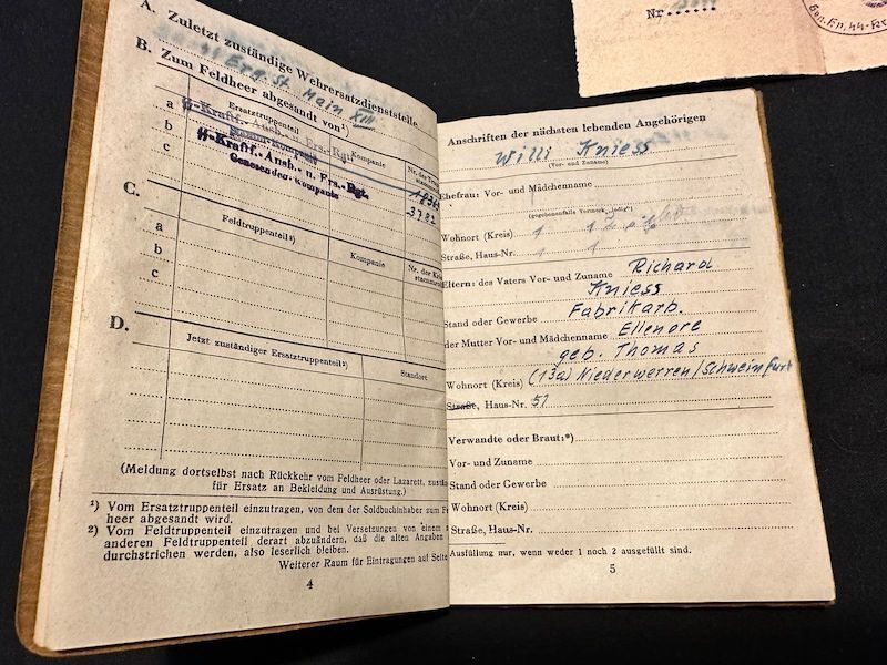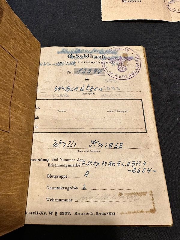 WWII Waffen SS Soldbuch – SS Schützen Willi Kniess – Wounded in Action – Wounds Badge in Black (Sold)
