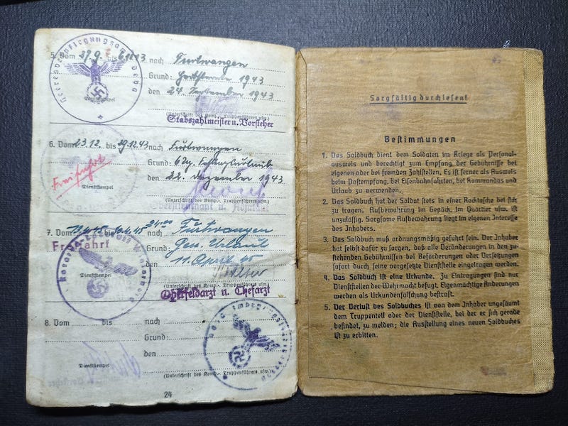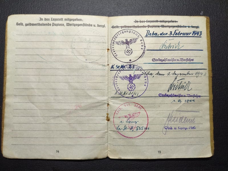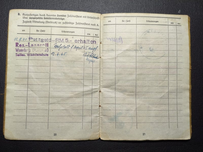 He was later released in April 1945 and was sent to his unit again, although by that stage of the war who knows where he ended up, likely in an adhoc unit which sadly is not recorded in his Soldbuch.